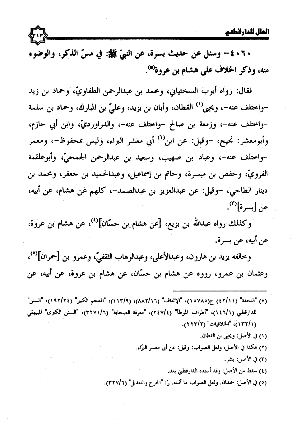 4060- وسئل عن حديث بسرة، عَنِ النَّبِيِّ صَلَّى اللَّهُ عَلَيْهِ وَسَلَّمَ فِي مس الذكر والوضوء منه، وذكر الخلاف على هشام بن عروة.