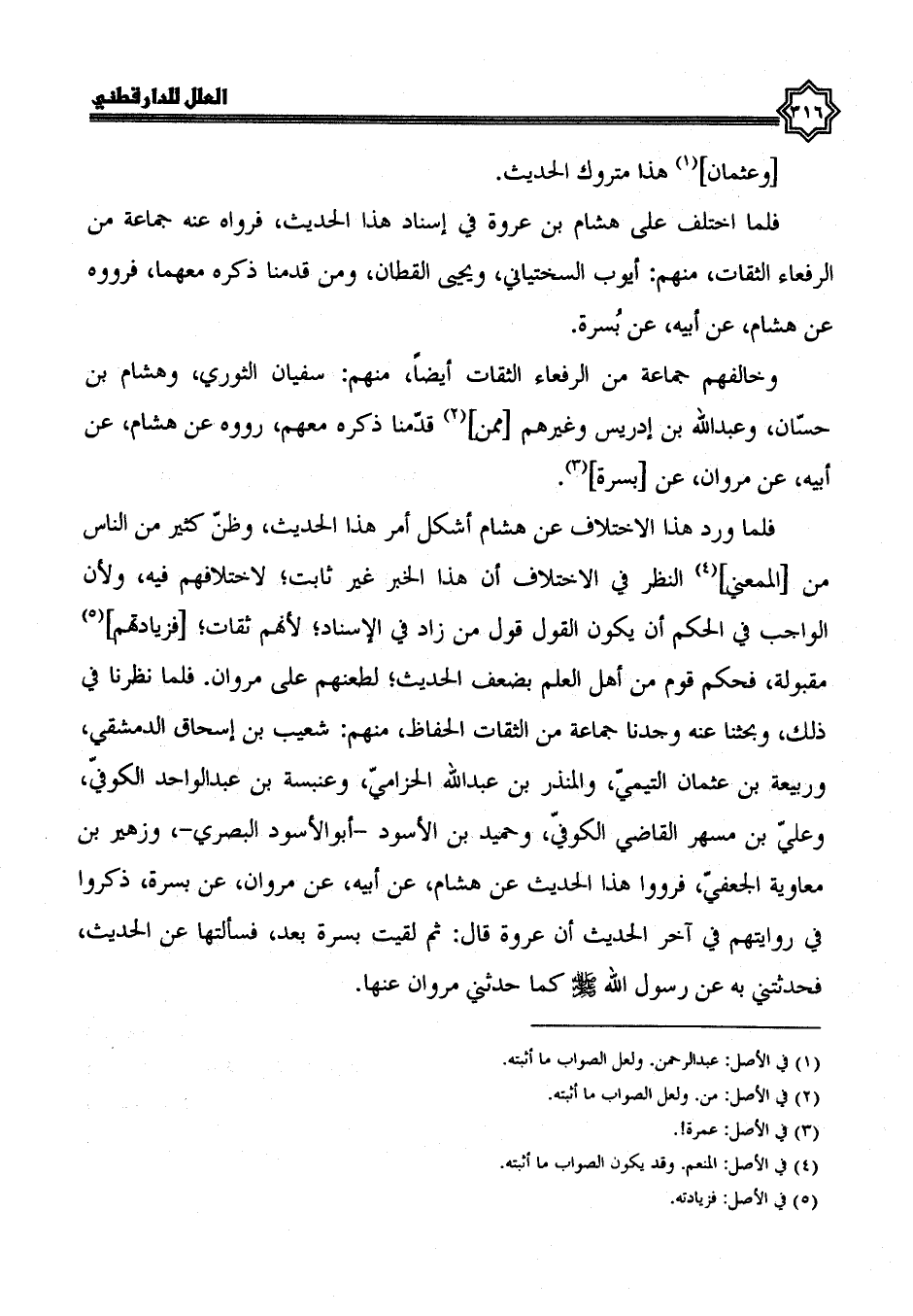 فرووه عن هشام، عن أبيه، عن بسرة وخالفهم جماعة من الرفعاء الثقات أيضا منهم سفيان الثوري، وهشام بن حسان، وعبد الله بن إدريس، وغيرهم ممن قدمنا ذكره معهم، رووه عَنْ هِشَامٍ، عَنْ أَبِيهِ، عَنْ مَرْوَانَ، عَنْ بسرة، فلما ورد هذا الاختلاف عن هشام أشكل أمر هذا الحديث، وظن كثير من الناس من الممعني النظر في الاختلاف أن هذا الخبر غير ثابت لاختلافهم فيه، ولأن الواجب في الحكم أن يكون القول قول من زاد في الإسناد، لأنهم ثقات فزيادته مقبولة، فحكم قوم من أهل العلم بضعف الحديث لطعنهم على مروان، فلما نظرنا في ذلك وبحثنا عنه وجدنا جماعة من الثقات الحفاظ منهم شعيب بن إسحاق الدمشقي، وربيعة بن عثمان التيمي، والمنذر بن عبد الله الحزامي، وعنبسة بن عبد الواحد الكوفي، وعلي بن مسهر القاضي الكوفي، وحميد بن الأسود أبو الأسود البصري، وزهير بن معاوية الجعفي، فرووا هذا الحديث عَنْ هِشَامٍ، عَنْ أَبِيهِ، عَنْ مَرْوَانَ، عَنْ بسرة، ذكروا في روايتهم في آخر الحديث، أن عروة قال: ثم لقيت بسرة بعد فسألتها عن الحديث، فحدثتني بِهِ عَنْ رَسُولِ اللَّهِ صَلَّى اللَّهُ عَلَيْهِ وَسَلَّمَ، كما حدثني مروان عنها،