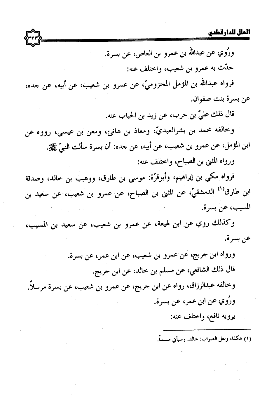 فرواه مكي بن إبراهيم، وأبو قرة: موسى بن طارق، ووهيب بن خالد، وصدقة بن طارق الدمشقي، عَنِ الْمُثَنَّى بْنِ الصَّبَّاحِ، عَنْ عَمْرِو بْنِ شعيب، عن سعيد بن المسيب، عن بسرة.