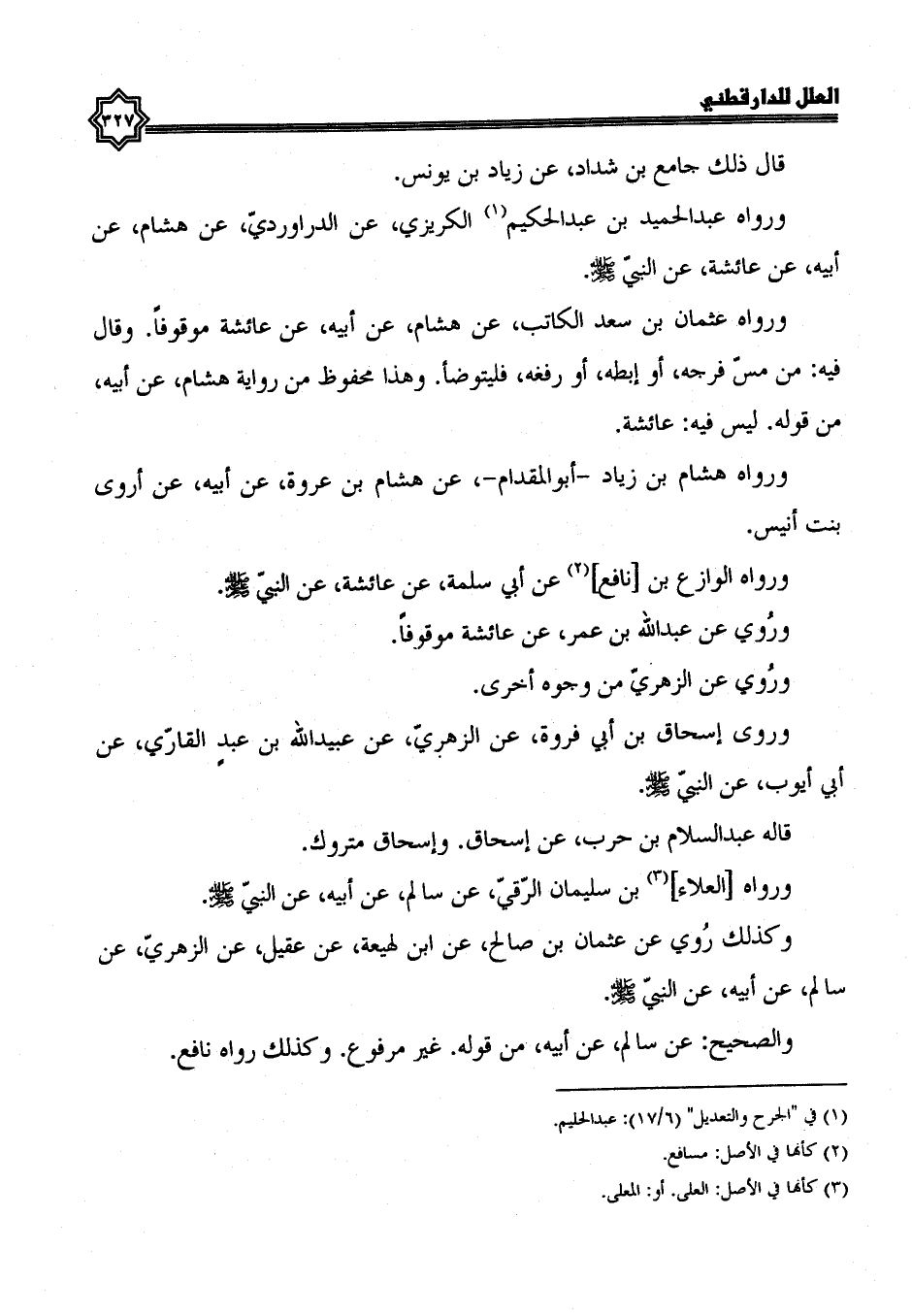 ورواه عثمان بن سعد الكاتب، عن هشام، عن أبيه، عن عائشة، موقوفا، وقال فيه: من مس فرجه، أو إبطه، أو رفغه، فليتوضأ، وهذا محفوظ من رواية هشام، عن أبيه، من قوله، ليس فيه: عائشة.
