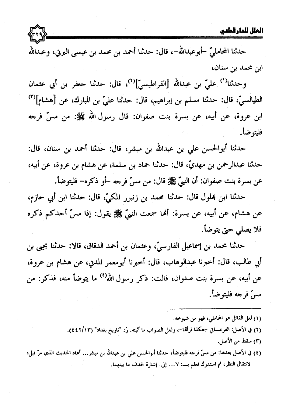 حدثنا المحاملي أبو عبد الله، قال: حدثنا أحمد بن محمد بن عيسى البرتي، وعبد الله بن محمد بن سنان، وحدثنا علي بن عبد الله القراطيسي، قال: حدثنا جعفر بن أبي عثمان الطيالسي، قال: حدثنا مسلم بن إبراهيم، قال: حدثنا علي بن المبارك، عن هشام بن عروة، عن أبيه، عن بسرة بنت صفوان، قال رسول الله صلى الله عليه وسلم: من مس فرجه فليتوضأ.