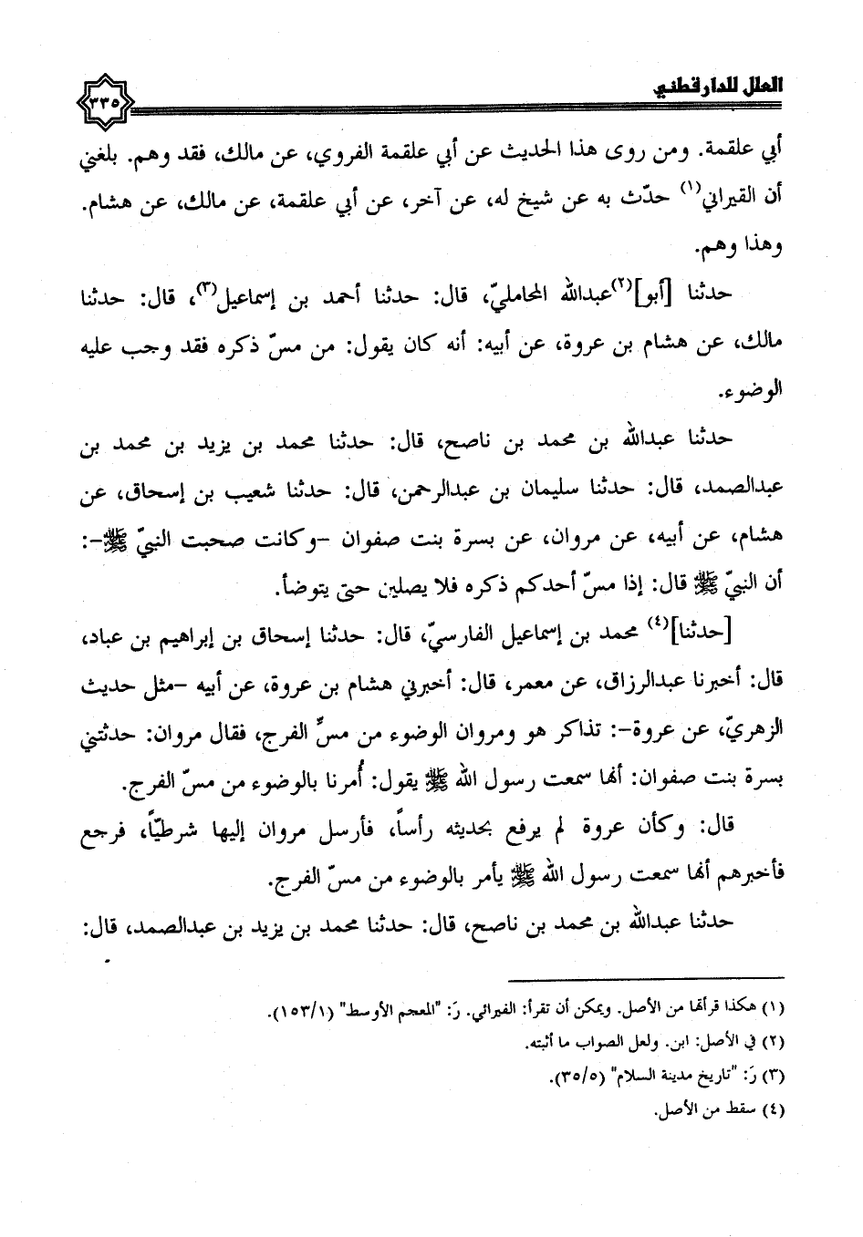 حدثنا أبو عبد الله المحاملي، قال: حدثنا أحمد بن إسماعيل، قال: حدثنا مَالِكٌ، عَنْ هِشَامِ بْنِ عُرْوَةَ، عَنْ أَبِيهِ، أنه كان يقول: من مس ذكره فقد وجب عليه الوضوء، حَدَّثَنَا عَبْدُ اللَّهِ بْنُ مُحَمَّدِ بْنِ نَاصِحٍ، قال: حدثنا محمد بن يزيد بن محمد بن عبد الصمد، قال: حدثنا سليمان بن عبد الرحمن، قال: حدثنا شعيب بن إسحاق، عَنْ هِشَامٍ، عَنْ أَبِيهِ، عَنْ مَرْوَانَ، عَنْ بسرة بنت صفوان، وكانت صحبت النَّبِيِّ صَلَّى اللَّهُ عَلَيْهِ وَسَلَّمَ، أَنَّ النَّبِيَّ صلى الله عليه وسلم، قال: إذا مس أحدكم ذكره فلا يصلين حتى يتوضأ.