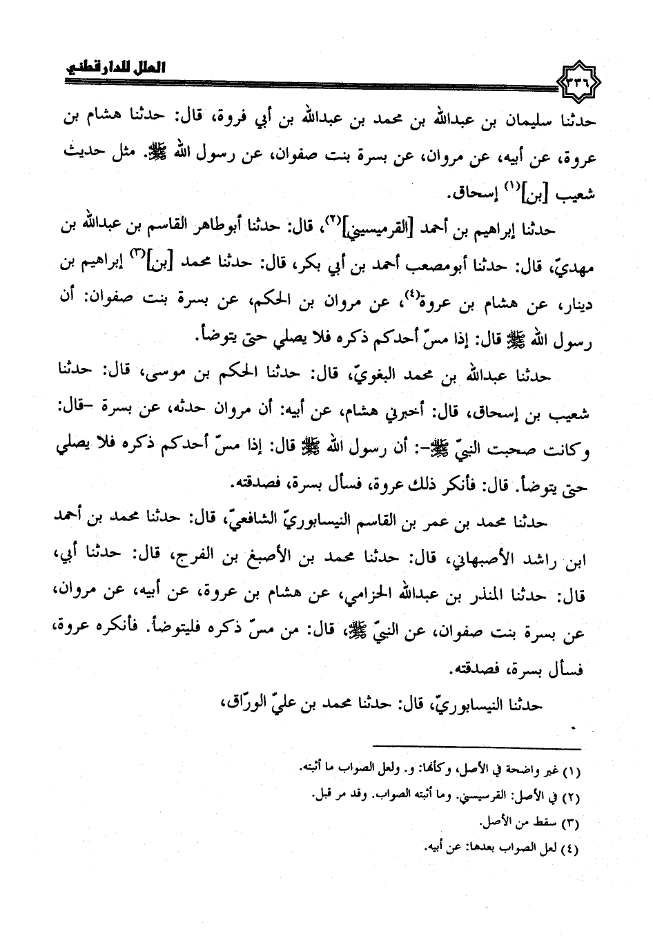 حدثنا محمد بن عمر بن القاسم النيسابوري الشافعي، قال: حدثنا محمد بن أحمد بن راشد الأصبهاني، قال: حدثنا محمد بن الأصبغ بن الفرج، قال: حدثنا أبي، قال: حدثنا المنذر بن عبد الله الحزامي، عن هشام بن عروة، عن أبيه، عن مروان، عن بسرة بنت صفوان، عن النبي صلى الله عليه وسلم، قال: من مس ذكره فليتوضأ فأنكره عروة، فسأل بسرة فصدقته.