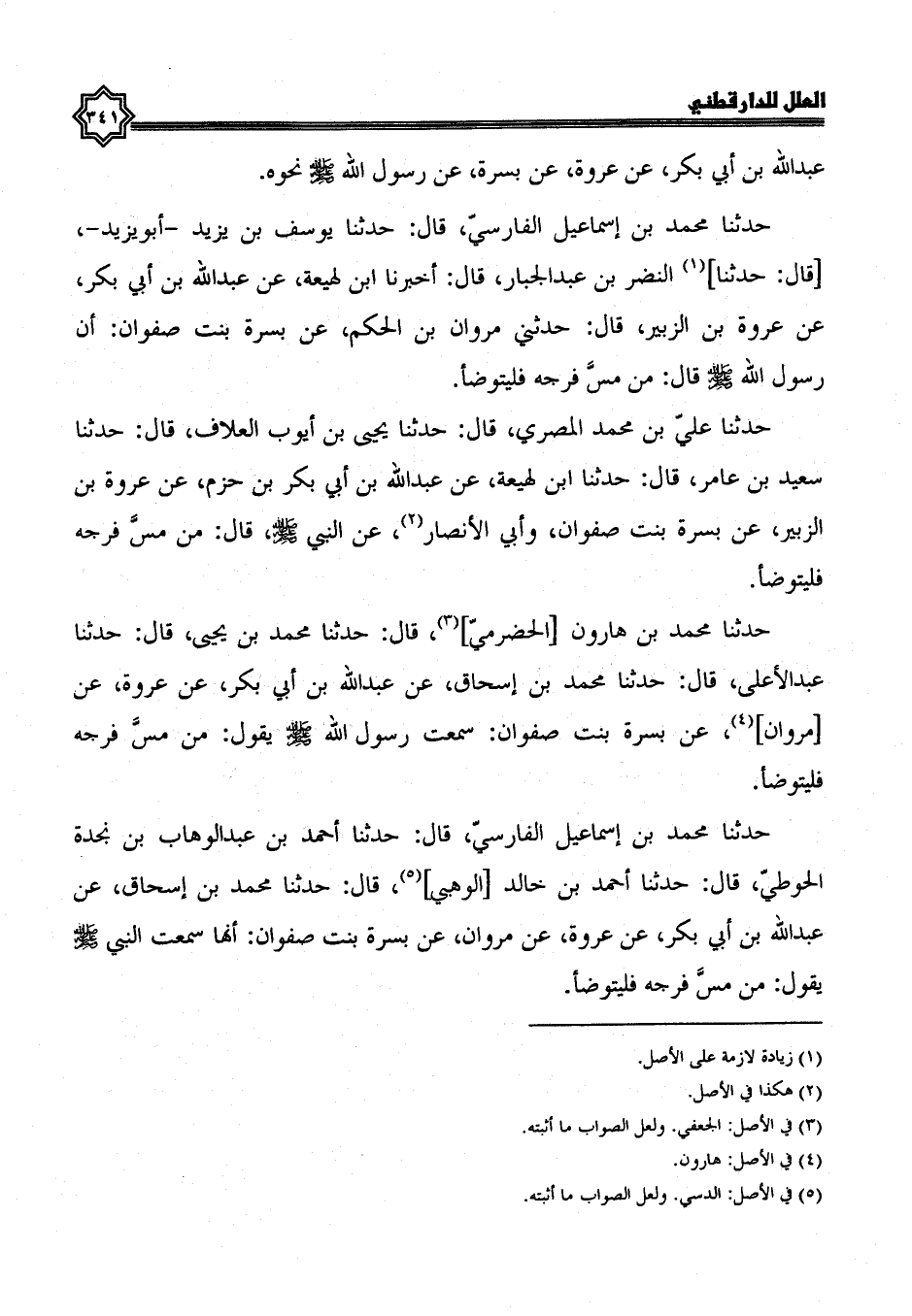 حدثنا محمد بن إسماعيل الفارسي، قال: حدثنا أحمد بن عبد الوهاب بن نجدة الحوطي، قال: حدثنا أحمد بن خالد الوهبي، قال: حدثنا مُحَمَّدُ بْنُ إِسْحَاقَ، عَنْ عَبْدِ اللَّهِ بْنِ أبي بكر، عن عروة، عن مروان، عن بسرة بنت صفوان، أنها سَمِعْتُ النَّبِيَّ صَلَّى اللَّهُ عَلَيْهِ وَسَلَّمَ، يَقُولُ: من مس فرجه فليتوضأ.