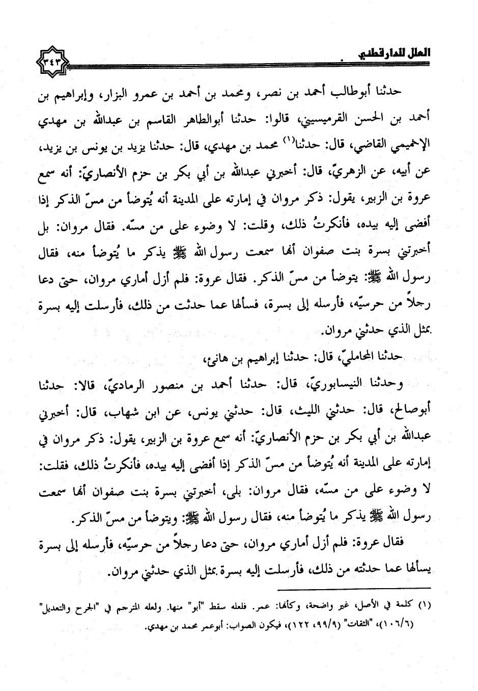 حدثنا المحاملي، قال: حدثنا إبراهيم بن هانئ، وحدثنا النيسابوري، قال: حدثنا أحمد بن منصور الرمادي، قالا: حدثنا أبو صالح، قال: حدثني الليث، قال: حدثني يونس، عن ابن شهاب، قال: أخبرني عبد الله بن أبي بكر بن حزم الأنصاري، أنه سمع عروة بن الزبير، يقول: ذكر مروان في إمارته على المدينة أنه يتوضأ من مس الذكر إذا أفضى إليه بيده، فأنكرت ذلك، فقلت: لا وضوء على من مسه، فقال مروان: بلى أخبرتني بسرة بنت صفوان، أَنَّهَا سَمِعَتْ رَسُولَ اللَّهِ صَلَّى اللَّهُ عَلَيْهِ وسلم يذكر ما يتوضأ منه، فَقَالَ رَسُولُ اللَّهِ صَلَّى اللَّهُ عَلَيْهِ وَسَلَّمَ: ويتوضأ من مس الذكر.