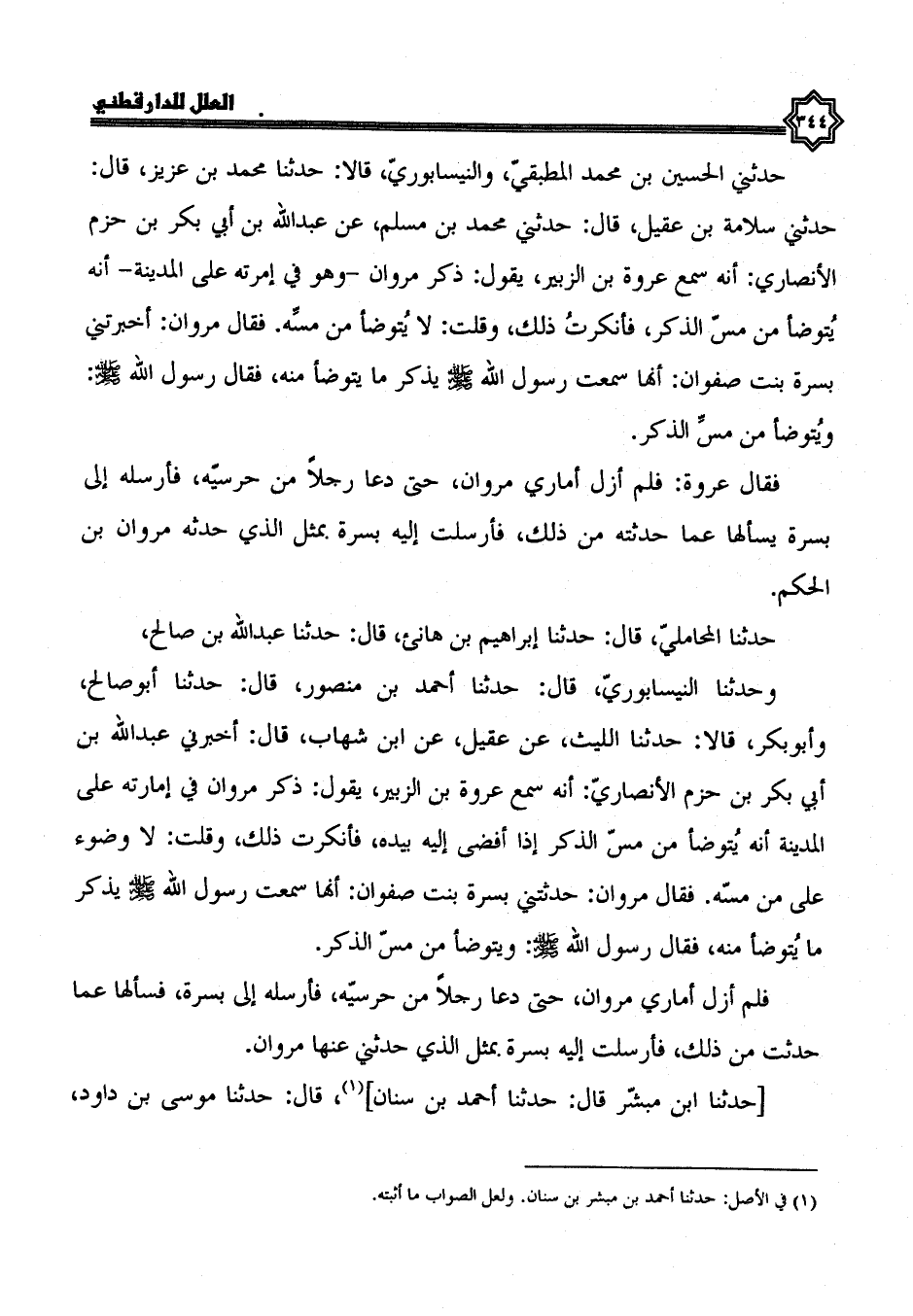 حدثنا المحاملي، قال: حدثنا إبراهيم بن هانئ، قال: حدثنا عبد الله بن صالح، وحدثنا النيسابوري، قال: حدثنا أحمد بن منصور، قالا: حدثنا أبو صالح، وأبو بكر، قالا: حدثنا الليث، عن عقيل، عن ابن شهاب، قال: أخبرني عبد الله بن أبي بكر بن حزم الأنصاري، أنه سمع عروة بن الزبير، يقول: ذكر مروان في إمارته على المدينة أنه يتوضأ من مس الذكر إذا أفضى إليه بيده، فأنكرت ذلك، وقلت: لا وضوء على من مسه فقال مروان: حدثتني بسرة بنت صفوان، أَنَّهَا سَمِعَتْ رَسُولَ اللَّهِ صَلَّى اللَّهُ عَلَيْهِ وسلم يذكر ما يتوضأ منه، فَقَالَ رَسُولُ اللَّهِ صَلَّى اللَّهُ عَلَيْهِ وَسَلَّمَ: ويتوضأ من مس الذكر فلم أزل أماري مروان حتى دعا رجلا من حرسيه، فأرسله إلى بسرة فسألها عما حدثت من ذلك، فأرسلت إليه بسرة مثل الذي حدثني عنها مروان حدثنا ابن مبشر، قال: حدثنا أحمد بن سنان، قال: حدثنا موسى بن داود،.