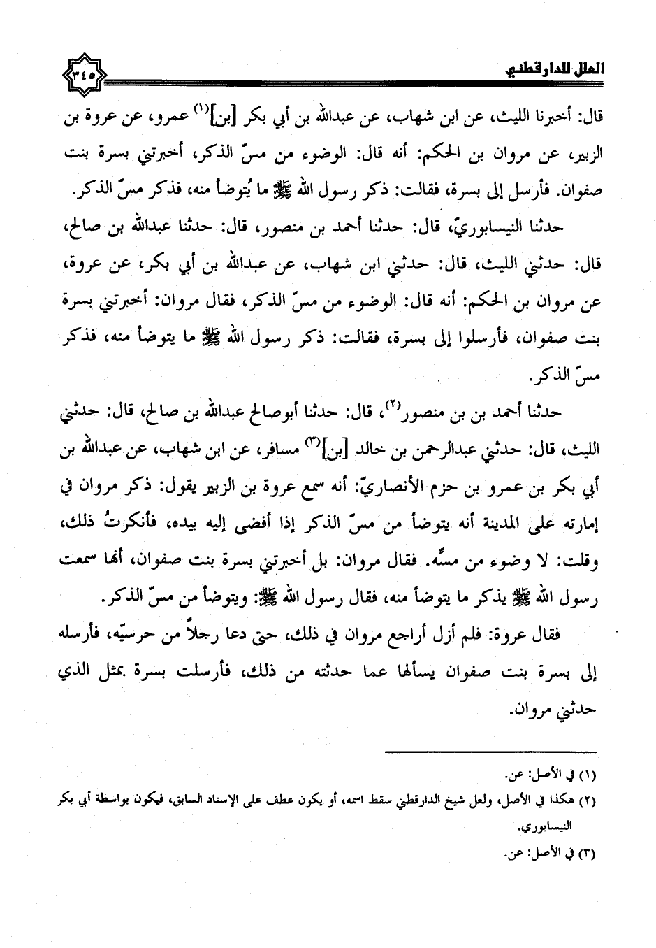 حدثنا أحمد بن منصور، قال: حدثنا أبو صالح عبد الله بن صالح، قال: حدثني الليث، قال: حَدَّثَنِي عَبْدُ الرَّحْمَنِ بْنُ خَالِدِ بْنِ مُسَافِرٍ، عَنِ ابن شهاب، عن عبد الله بن أبي بكر بن عمرو بن حزم الأنصاري، أنه سمع عروة بن الزبير، يقول: ذكر مروان في إمارته على المدينة أنه يتوضأ من مس الذكر إذا أفضى إليه بيده، فأنكرت ذلك، وقلت: لا وضوء من مسه، فقال مروان: بل أخبرتني بسرة بنت صفوان، أَنَّهَا سَمِعَتْ رَسُولَ اللَّهِ صَلَّى اللَّهُ عَلَيْهِ وسلم يذكر ما يتوضأ منه، فَقَالَ رَسُولُ اللَّهِ صَلَّى اللَّهُ عَلَيْهِ وَسَلَّمَ: ويتوضأ من مس الذكر، فقال عروة: فلم أزل أراجع مروان في ذلك حتى دعا رجلا من حرسيه فأرسله إلى بسرة بنت صفوان يسألها عما حدثته من ذلك، فأرسلت بسرة بمثل الذي حدثني مروان
