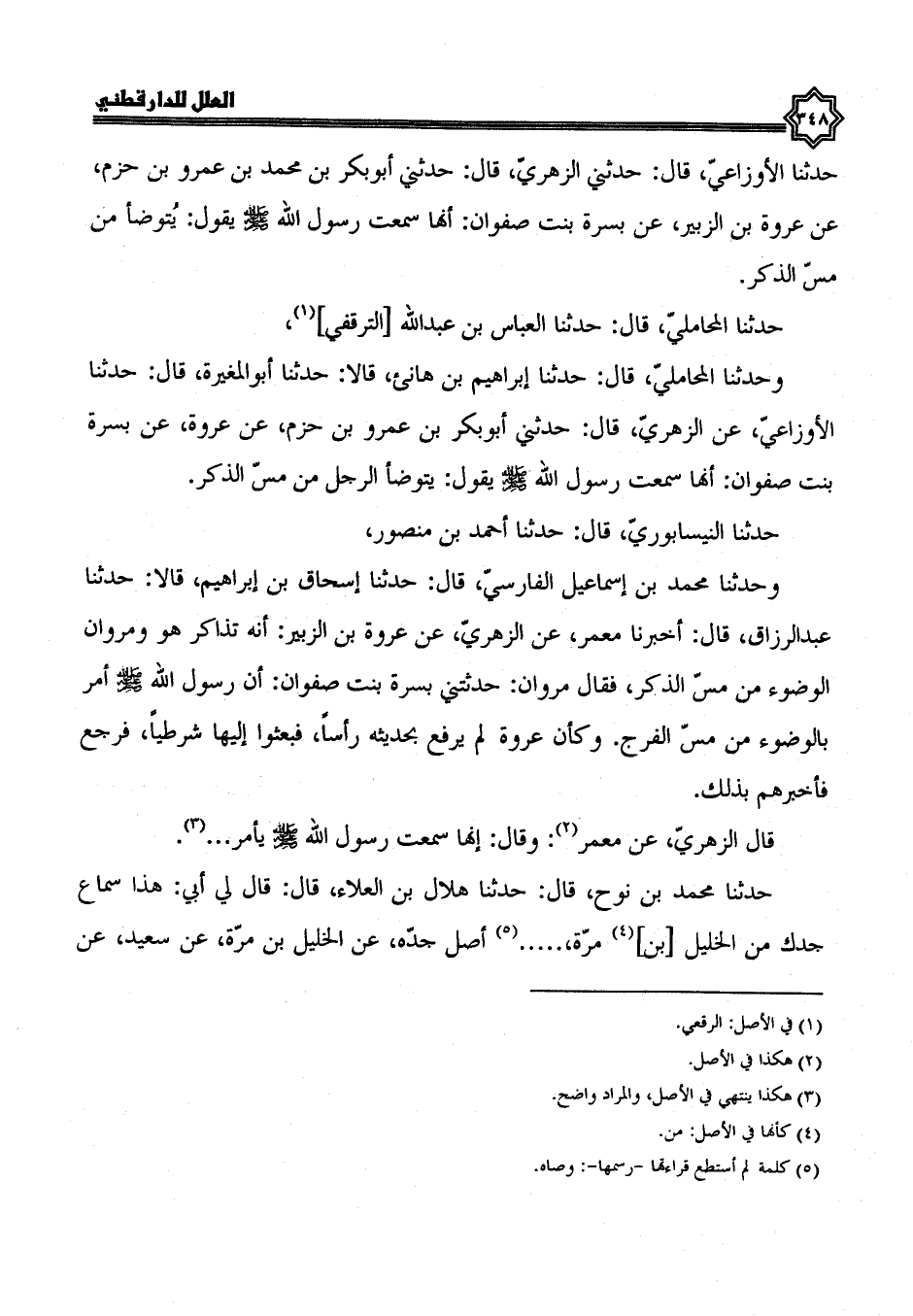 حدثنا المحاملي، قَالَ: حَدَّثَنَا الْعَبَّاسُ بْنُ عَبْدِ اللَّهِ التَّرَقُّفِيُّ وحدثنا المحاملي، قال: حدثنا إبراهيم بن هانئ، قالا: حدثنا أبو المغيرة، قال: حدثنا الأوزاعي، عن الزهري، قال: حدثني أبو بكر بن عمرو بن حزم، عن عروة، عن بسرة بنت صفوان، أَنَّهَا سَمِعَتْ رَسُولَ اللَّهِ صَلَّى اللَّهُ عَلَيْهِ وسلم، يقول: يتوضأ الرجل من مس الذكر.