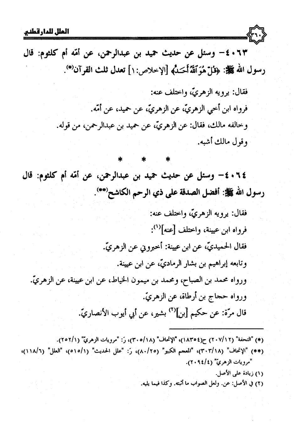 4063- وَسُئِلَ عَنْ حَدِيثِ حُمَيْدِ بْنِ عَبْدِ الرَّحْمَنِ، عن أمه أم كلثوم، قال رسول الله صلى الله عليه وسلم: {قل هو الله أحد} الإخلاص: 1 تَعْدِلُ ثُلُثَ الْقُرْآنِ.