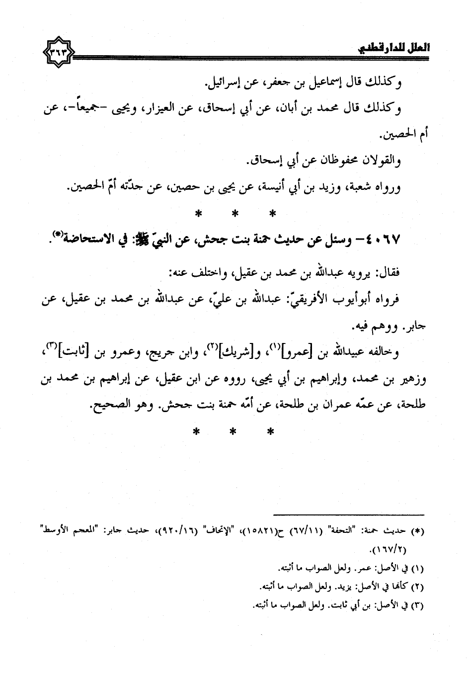 4067- وسئل عن حديث حمنة بنت جحش، عَنِ النَّبِيِّ صَلَّى اللَّهُ عَلَيْهِ وَسَلَّمَ، فِي الاستحاضة.
