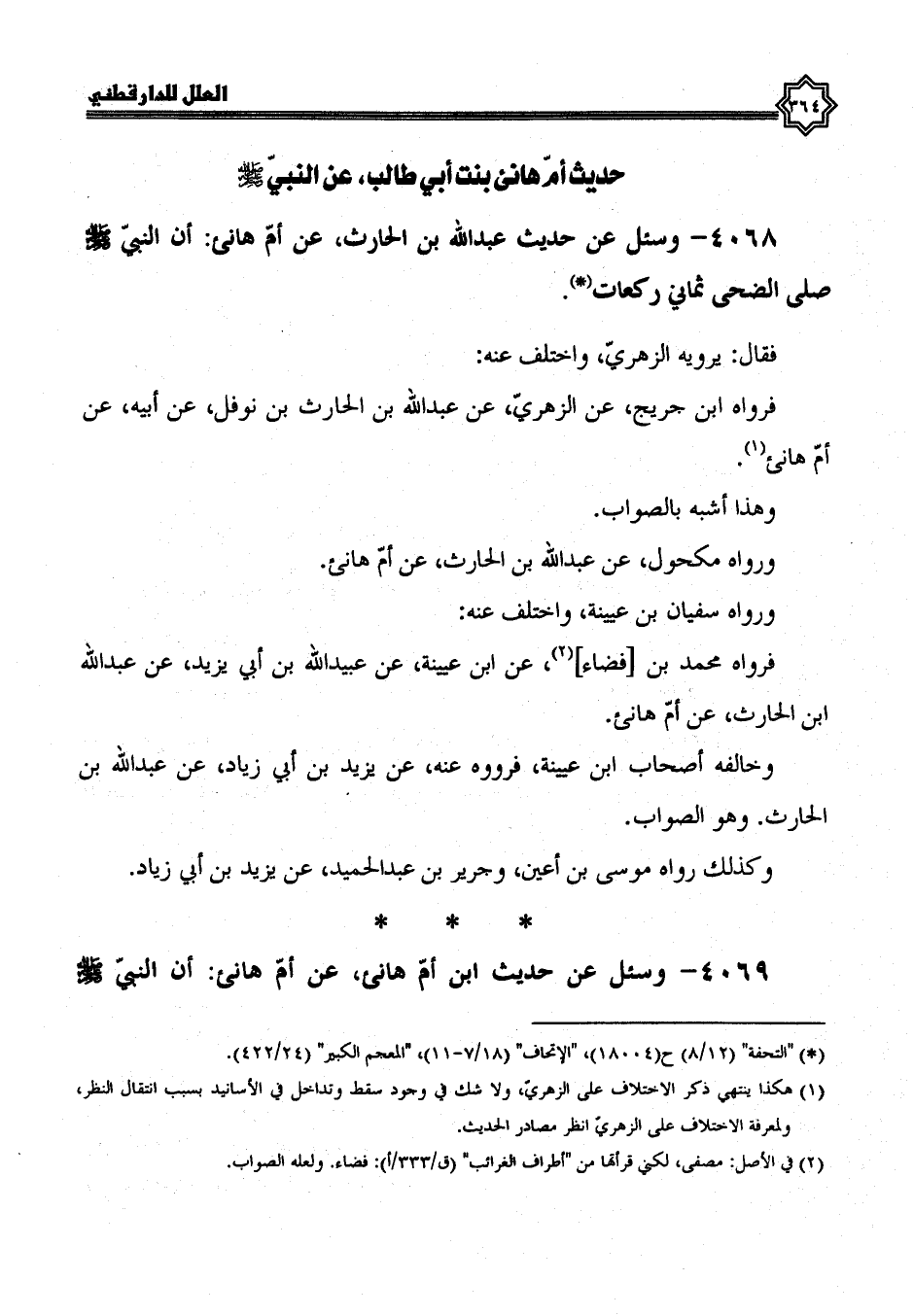 4068- وَسُئِلَ عَنْ حَدِيثِ عَبْدِ اللَّهِ بْنِ الْحَارِثِ، عن أم هانئ، أَنَّ النَّبِيَّ صَلَّى اللَّهُ عَلَيْهِ وَسَلَّمَ، صَلَّى الضحى ثماني ركعات.