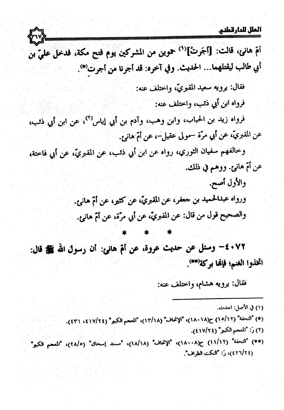 4072- وسئل عن حديث عروة، عن أم هانئ؛ أن رسول الله صلى الله عليه وسلم قال: اتخذوا الغنم؛ فإنها بركة.