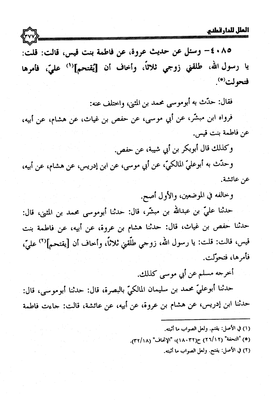 4085- وسئل عن حديث عروة، عن فاطمة بنت قيس، قالت: قلت: يا رسول الله طلقني زوجي ثلاثا، وأخاف أن يقتحم علي، فأمرها فتحولت.