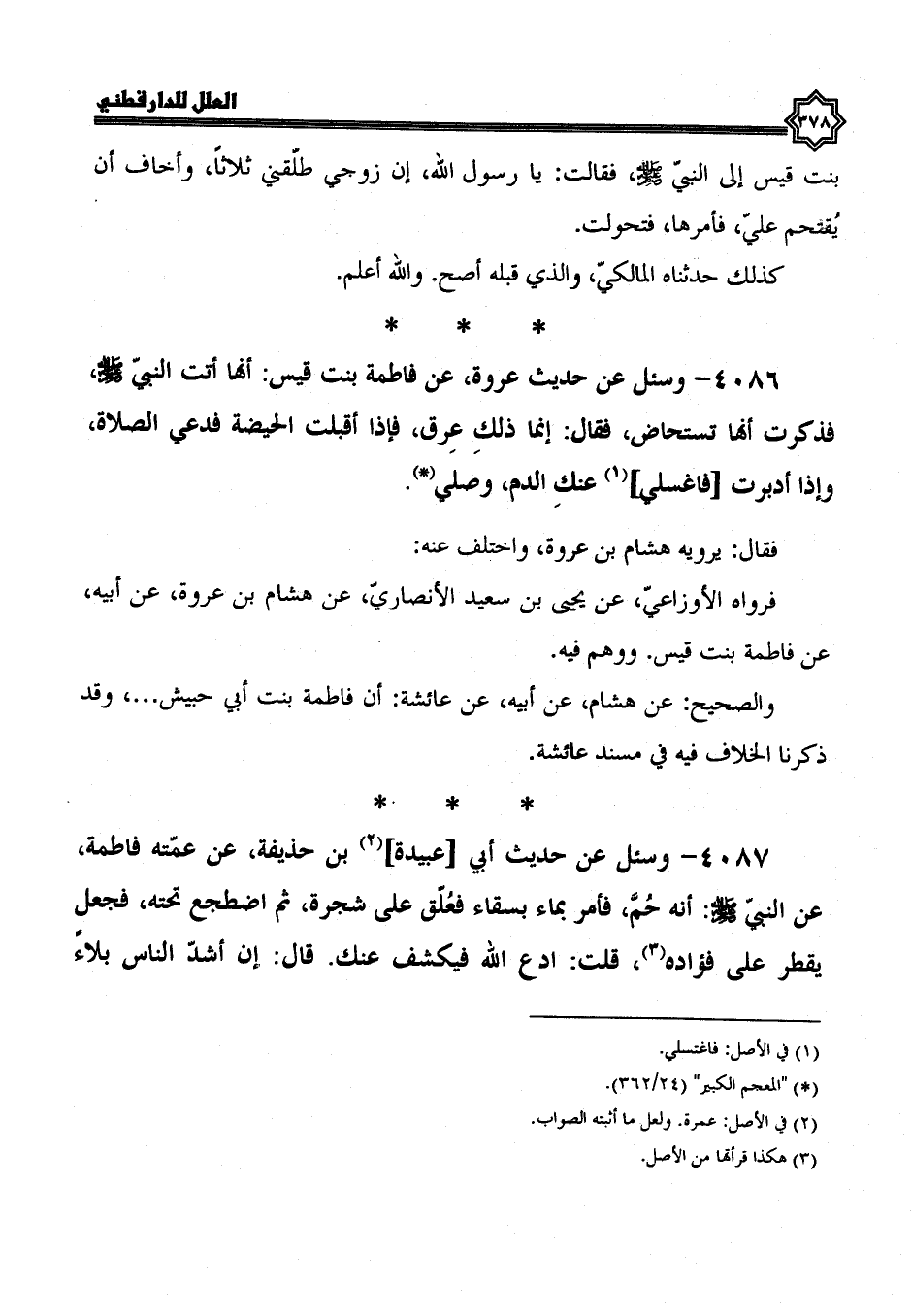 4086- وسئل عن حديث عروة، عن فاطمة بنت قيس، أنها أتت النبي صلى الله عليه وسلم، فذكرت أنها تستحاض فقال: إنما ذلك عرق، فإذا أقبلت الحيضة فدعي الصلاة، وإذا أدبرت فاغسلي عنك الدم وصلي.
