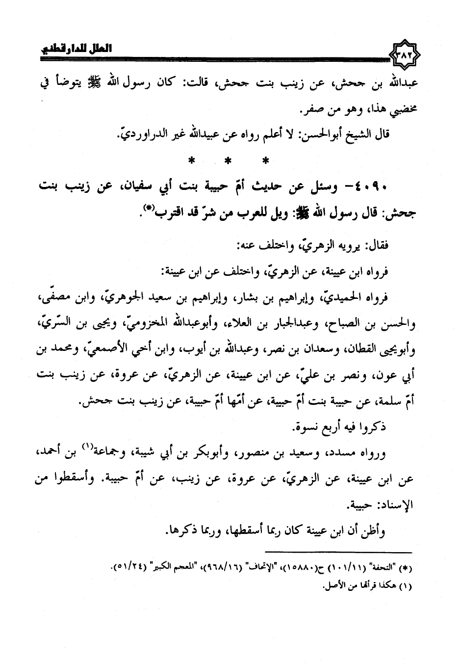 4090- وسئل عن حديث أم حبيبة بنت أبي سفيان، عن زينب بنت جحش، قال رسول الله صلى الله عليه وسلم: ويل للعرب من شر قد اقترب.