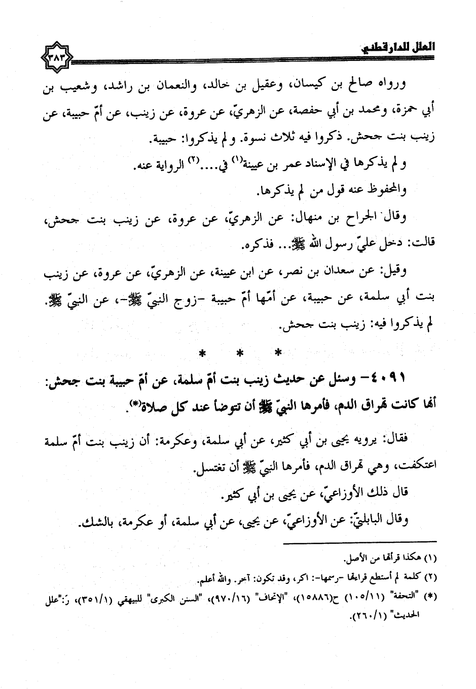 4091- وسئل عن حديث زينب بنت أم سلمة، عن أم حبيبة بنت جحش، أنها كانت تهراق الدم، فأمرها النبي صلى الله عليه وسلم أن تتوضأ عند كل صلاة.