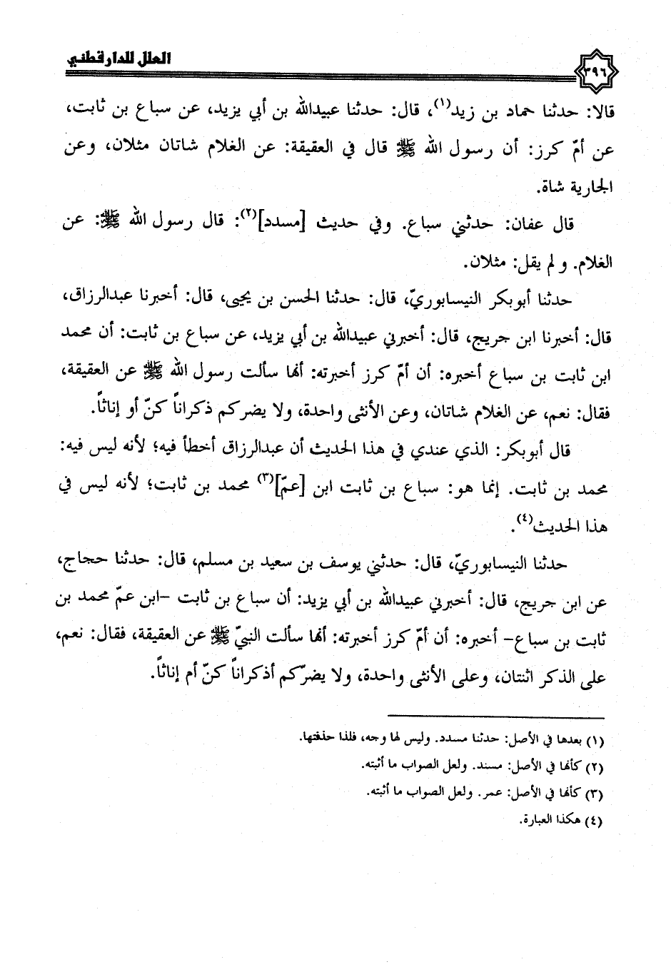 قالا: حدثنا حماد بن زيد، قال: حدثنا عبيد الله بن أبي يزيد، عن سباع بن ثابت، عن أم كرز أن رسول الله صلى الله عليه وسلم قال في العقيقة: عن الغلام شاتان مثلان، وعن الجارية شاة، قال عفان: حدثني سباع، وفي حديث مسدد قال رسول الله صلى الله عليه وسلم: عن الغلام ولم يقل: مثلان.