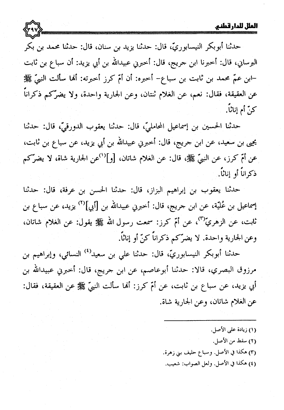 حدثنا أبوبكر النيسابوري، قال: حدثنا علي بن سعيد النسائي، وإبراهيم بن مرزوق البصري قالا: حدثنا أبو عاصم، عن ابن جريج، قال: أخبرني عبيد الله بن أبي يزيد، عن سباع بن ثابت، عن أم كرز أَنَّهَا سَأَلَتِ النَّبِيَّ صَلَّى اللَّهُ عَلَيْهِ وَسَلَّمَ، عن العقيقة، فقال: عن الغلام شاتان، وعن الجارية شاة،.