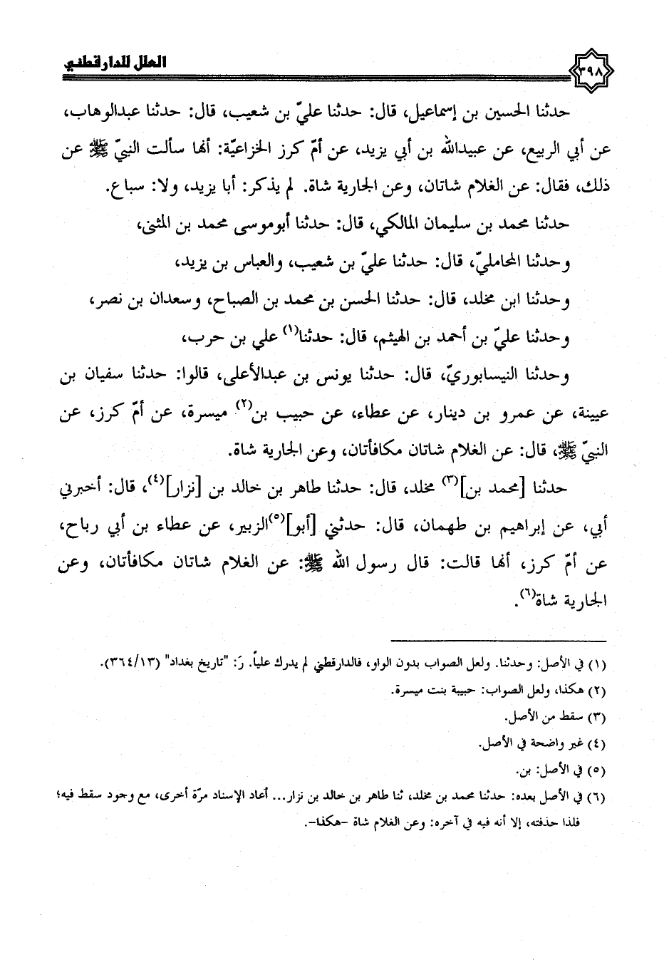 حدثنا محمد بن سليمان المالكي، قال: حدثنا أبو موسى محمد بن المثنى، وحدثنا (المحاملي، قال: حدثنا علي بن شعيب، والعباس بن يزيد، وحدثنا ابن مخلد، قال: حدثنا الحسن بن محمد بن الصباح، وسعدان بن نصر، وحدثنا علي بن أحمد بن الهيثم، قال: حدثنا علي بن حرب، وحدثنا النيسابوري، قال: حدثنا يونس بن عبد الأعلى، قالوا: حدثنا سُفْيَانُ بْنُ عُيَيْنَةَ، عَنْ عَمْرِو بْنِ دِينَارٍ، عَنْ عَطَاءٍ، عن حبيب بن ميسرة، عن أم كرز، عن النبي صلى الله عليه وسلم قال: عن الغلام شاتان مكافأتان، وعن الجارية شاة.