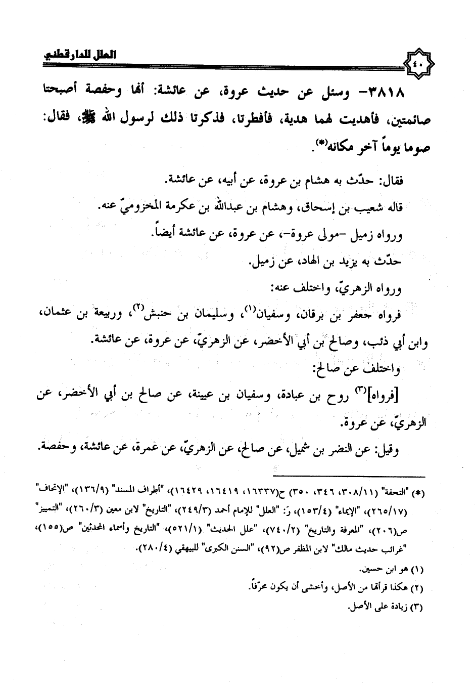 3818- وسئل عن حديث عروة، عن عائشة، أنها وحفصة أصبحتا صائمتين، فأهديت لهما هدية فأفطرتا، فذكرتا ذلك لرسول الله صلى الله عليه وسلم، فقال: صوما يوما آخر مكانه.