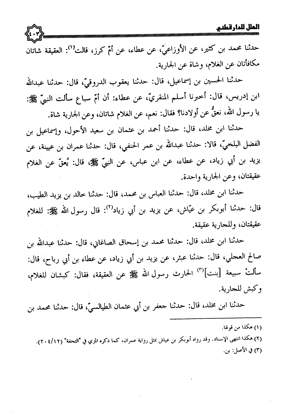 حدثنا ابن مخلد، قال: حدثنا العباس بن محمد، قال: حدثنا خالد بن يزيد الطيب، قال: حدثنا أبوبكر بن عياش، عن يزيد بن أبي زياد، قال رسول الله صلى الله عليه وسلم: للغلام عقيقتان وللجارية عقيقة.