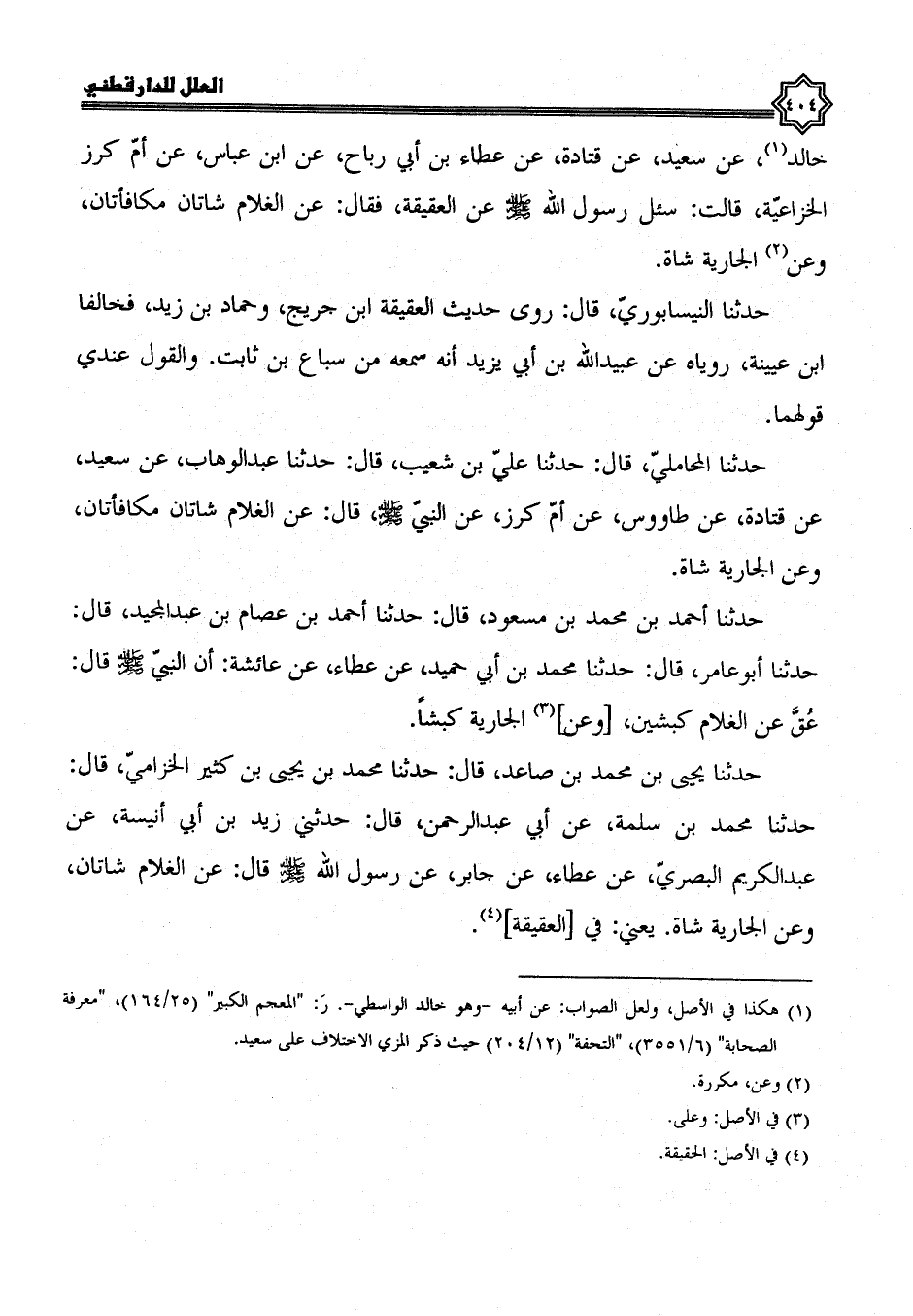 حدثنا المحاملي، قال: حدثنا علي بن شعيب، قال: حدثنا عبد الوهاب، عن سعيد، عن قتادة، عن طاووس، عن أم كرز، عن النبي صلى الله عليه وسلم، قال: عن الغلام شاتان مكافأتان، وعن الجارية شاة.
