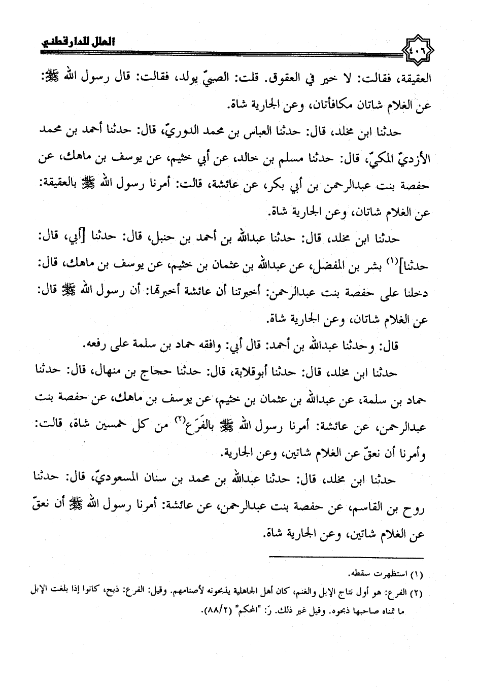 حدثنا ابن مخلد، قال: حدثنا عبد الله بن محمد بن سنان المسعودي، قال: حدثنا روح بن القاسم، عن حفصة بنت عبد الرحمن، عن عائشة أَمَرَنَا رَسُولُ اللَّهِ صَلَّى اللَّهُ عَلَيْهِ وَسَلَّمَ أن نعق، عن الغلام شاتين، وعن الجارية شاة.