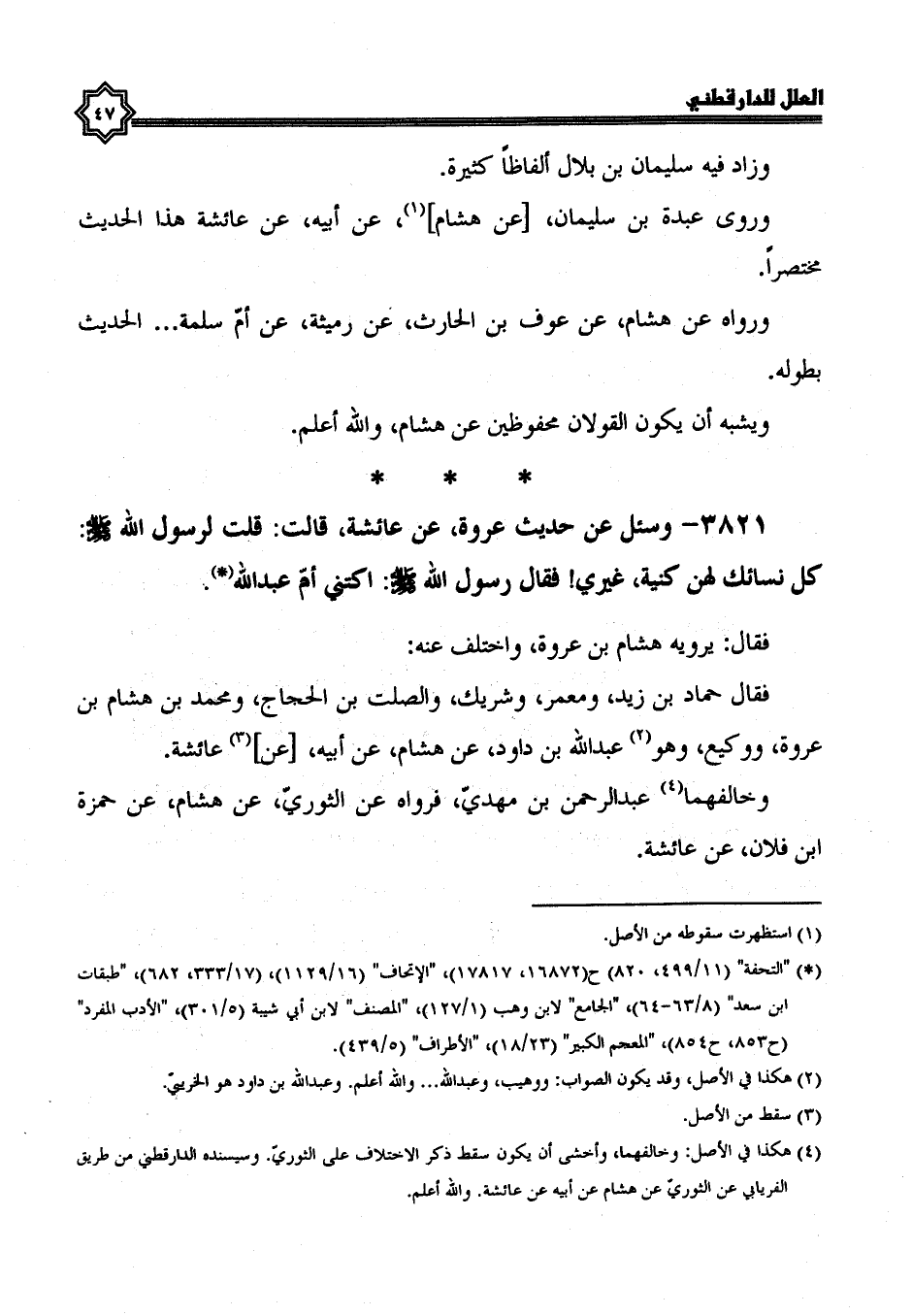فقال حماد بن زيد ومعمر، وشريك، والصلت بن الحجاج، ومحمد بن هشام بن عروة، ووكيع وهو عبد الله بن داود، عن هشام، عن أبيه، عن عائشة وخالفهما عَبْدُ الرَّحْمَنِ بْنُ مَهْدِيٍّ؛