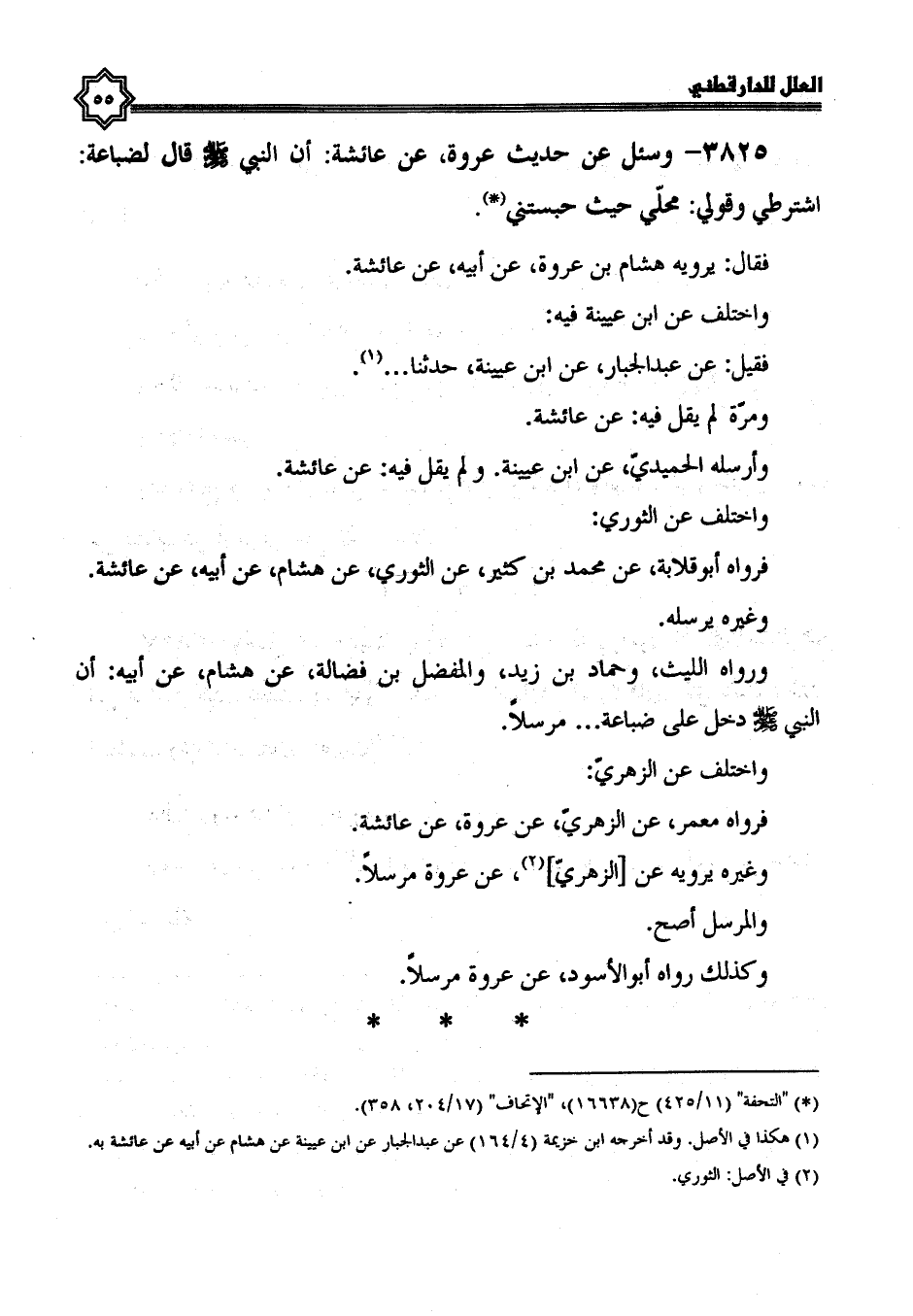 3825- وسئل عن حديث عروة، عن عائشة، أن النبي صلى الله عليه وسلم قال لضباعة: اشترطي وقولي محلي حيث حبستني.