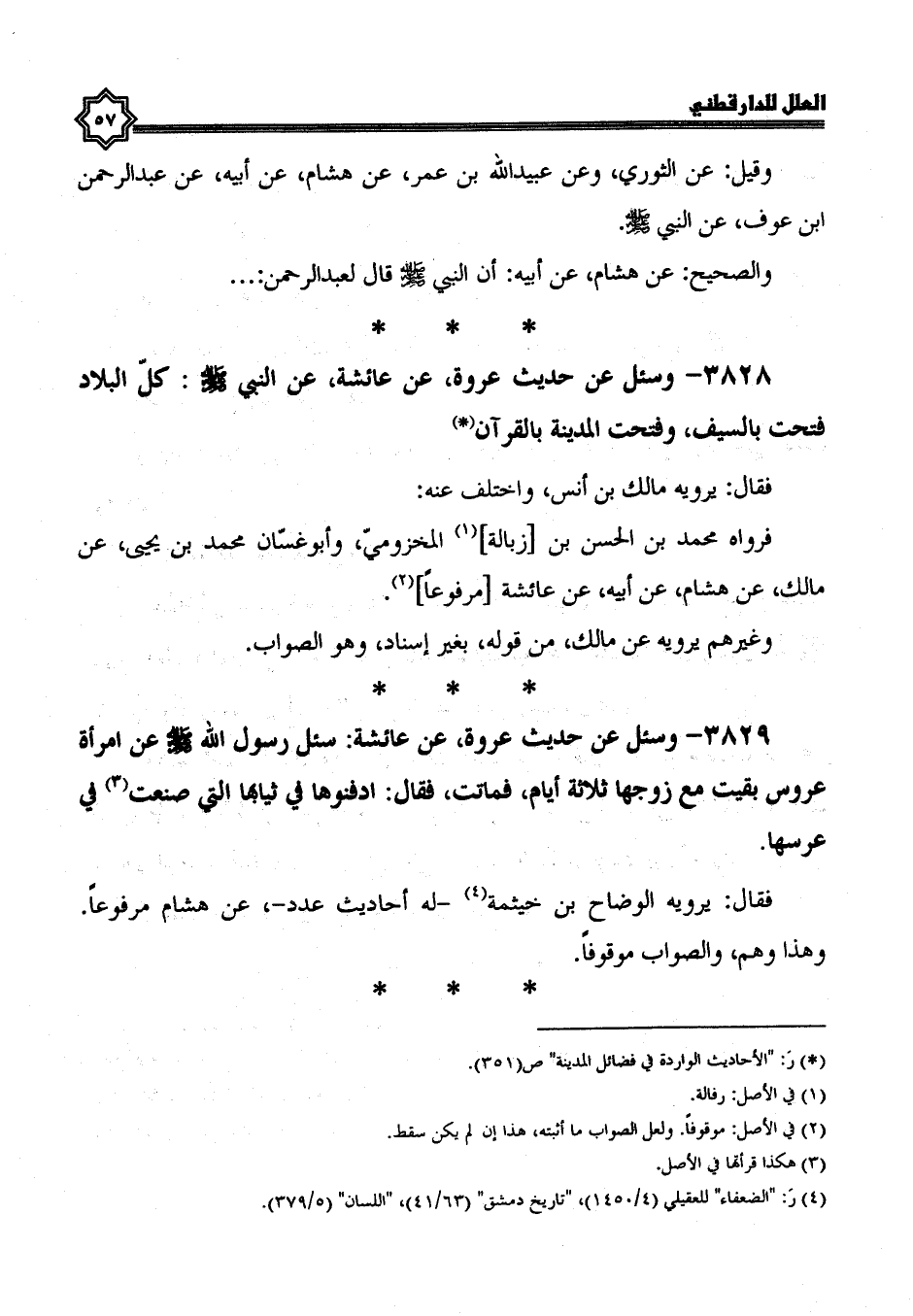 3828- وَسُئِلَ عَنْ حَدِيثِ عُرْوَةَ، عَنْ عَائِشَةَ، عَنْ النَّبِيِّ صَلَّى اللَّهُ عَلَيْهِ وسلم: كل البلاد فتحت بالسيف، وفتحت المدينة بالقرآن.