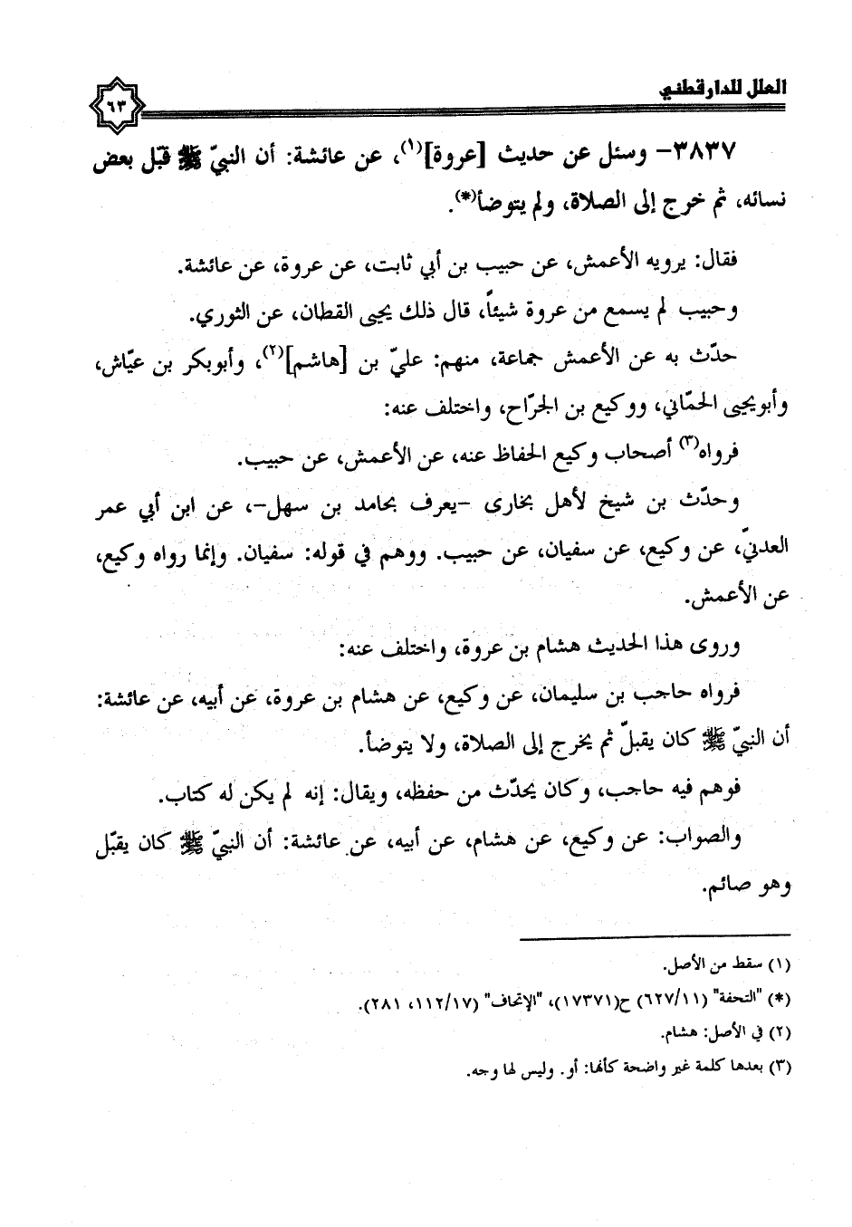 وزاد فيه زيادة كثيرة، تفرد بها وكلها وهم والصحيح عن هشام، عن أبيه، عن عائشة، أن النبي صلى الله عليه وسلم كان يقبل وهو صائم وكذلك رواه الزهري، عن عروة، عن عائشة، حدث به عنه الأوزاعي، وابن عيينة، ومعمر، وأسامة بن زيد.
