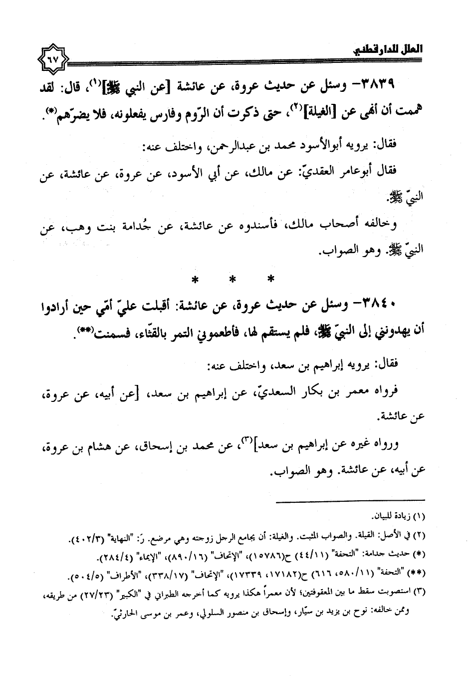 3839- وَسُئِلَ عَنْ حَدِيثِ عُرْوَةَ، عَنْ عَائِشَةَ، عَنْ النَّبِيِّ صَلَّى اللَّهُ عَلَيْهِ وسلم، قال: لقد هممت أن أنهى عن الغيلة، حتى ذكرت أن الروم وفارس يفعلونه فلا يضرهم.