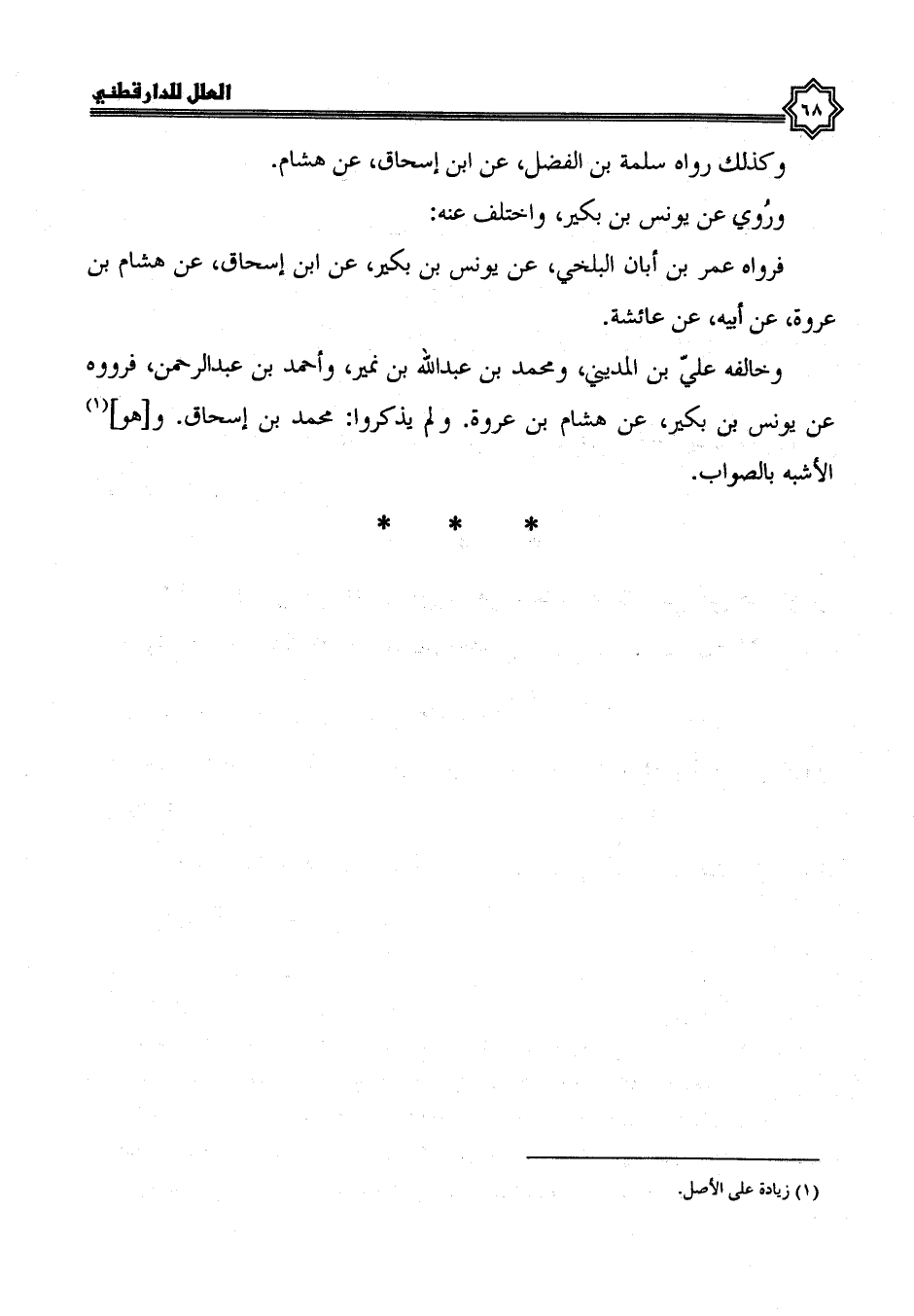 وخالفه علي بن المديني، ومحمد بن عبد الله بن نمير، وأحمد بن عبد الرحمن، فرووه عن يونس بن بكير، عن هشام بن عروة، ولم يذكروا: محمد بن إسحاق، وهو الأشبه بالصواب.
