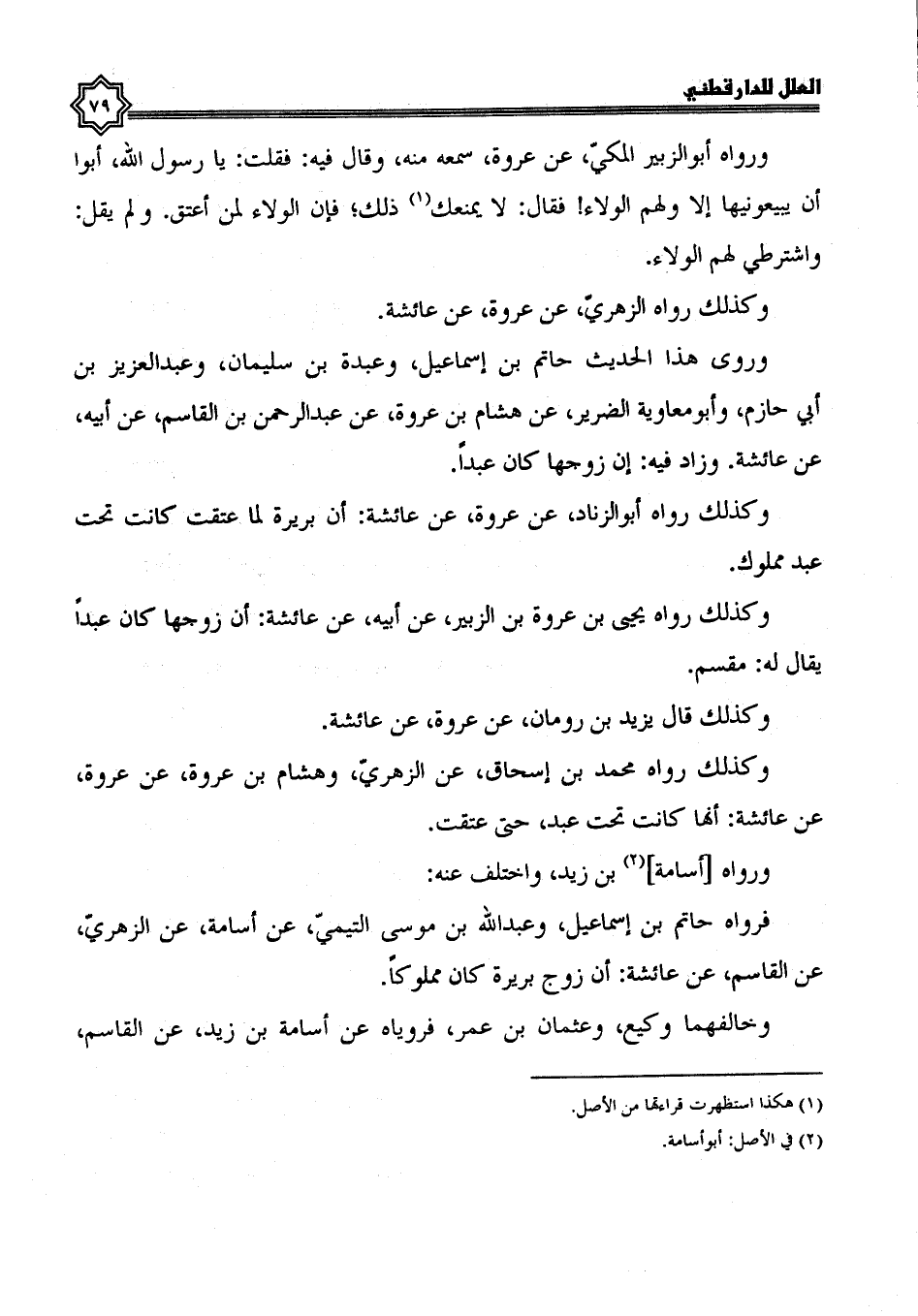 فرواه حاتم بن إسماعيل، وعبد الله بن موسى التيمي، عن أسامة، عن الزهري، عن القاسم، عن عائشة، أن زوج بريرة كان مملوكا وخالفهما وكيع، وعثمان بن عمر، فروياه عن أسامة بن زيد، عن القاسم،