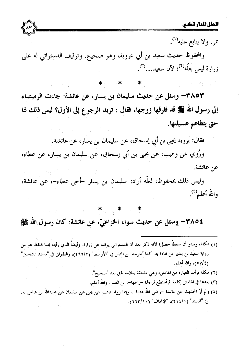 3853- وَسُئِلَ عَنْ حَدِيثِ سُلَيْمَانَ بْنِ يَسَارٍ، عَنْ عائشة، جاءت الرميصاء إِلَى رَسُولِ اللَّهِ صَلَّى اللَّهُ عَلَيْهِ وَسَلَّمَ قد فارقها زوجها فقال: تريد الرجوع إلى الأول ليس ذلك لها حتى يتطاعم عسيلتها.