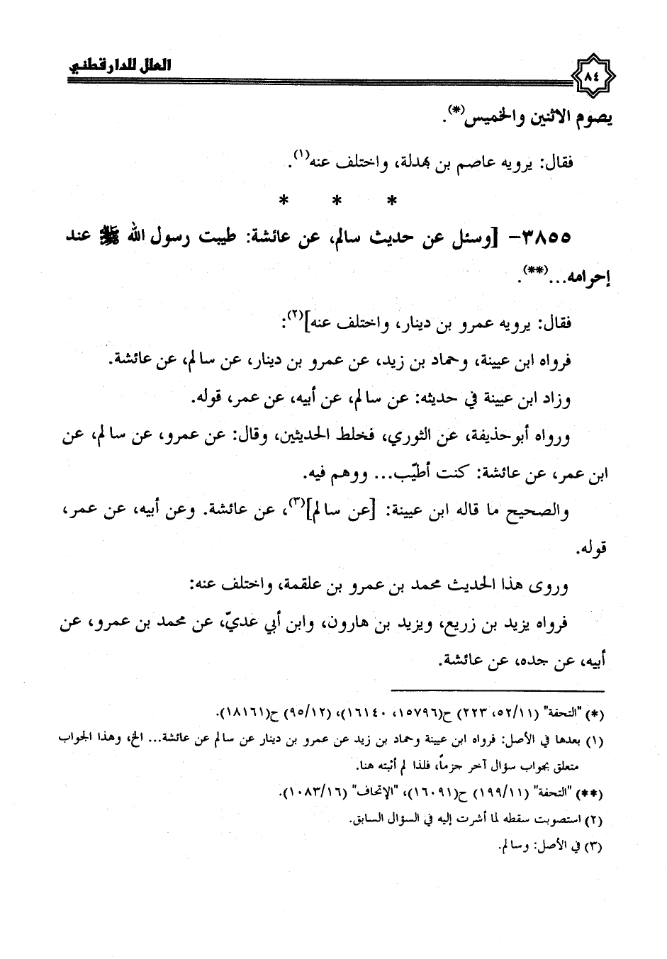 3855- وسئل عن حديث سالم، عن عائشة؛ طيبت رسول الله صلى الله عليه وسلم عند إحرامه ...