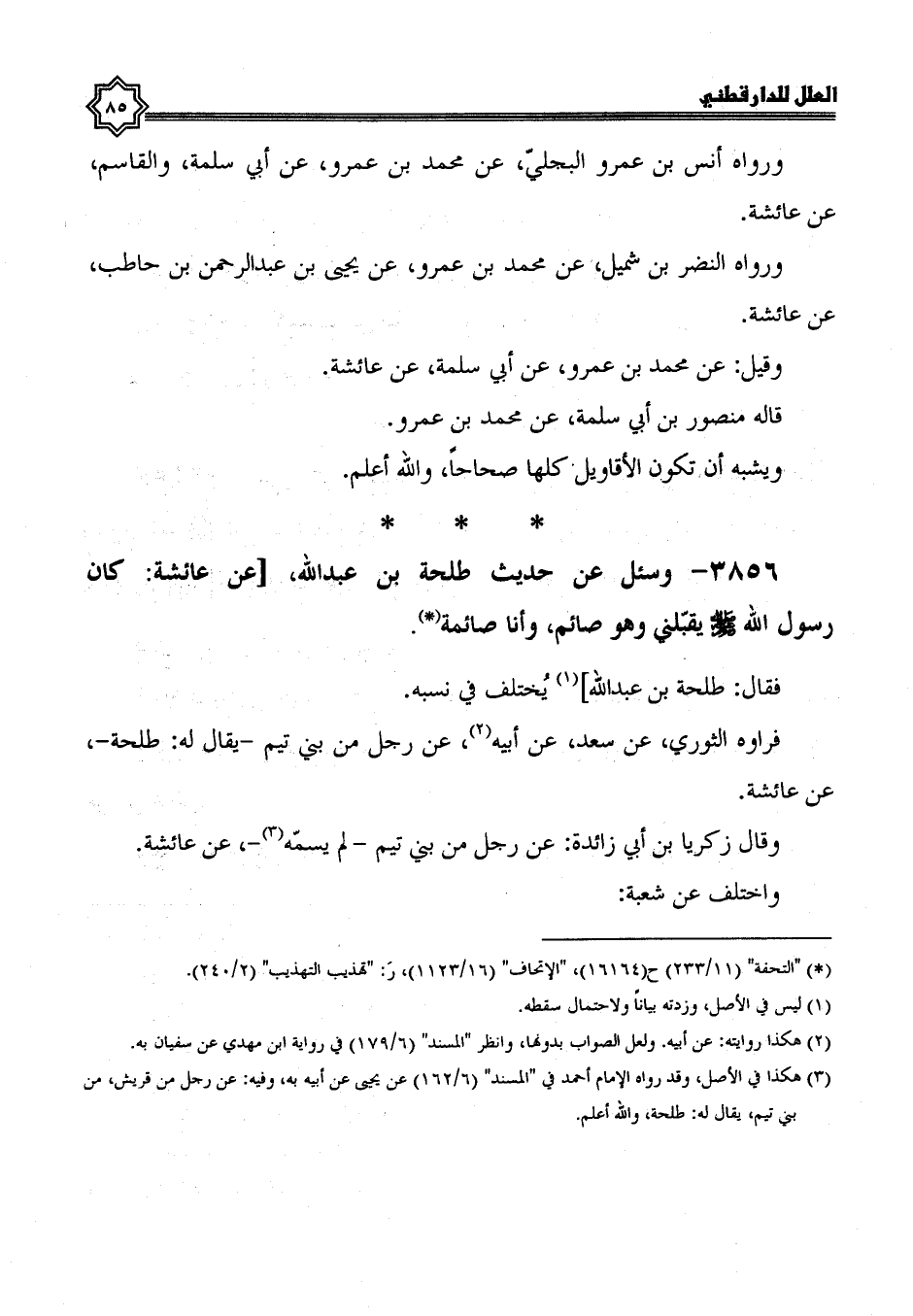 3856- وسئل عن حديث طلحة بن عبد الله، عن عائشة؛ كَانَ رَسُولُ اللَّهِ صَلَّى اللَّهُ عَلَيْهِ وَسَلَّمَ يقبلني وهو صائم، وأنا صائمة.