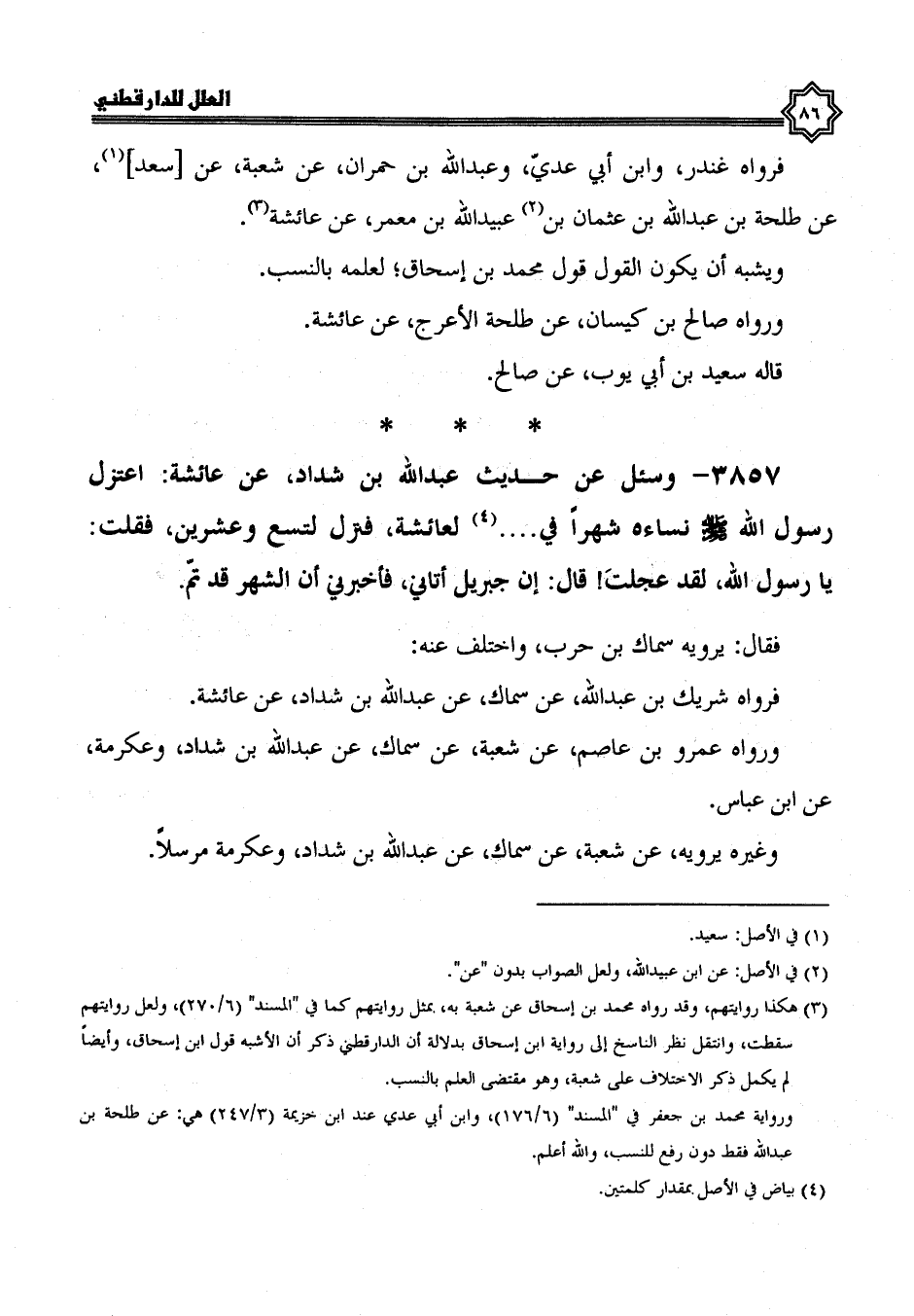 3857- وَسُئِلَ عَنْ حَدِيثِ عَبْدِ اللَّهِ بْنِ شَدَّادِ، عن عائشة، اعتزل رسول الله صلى الله عليه وسلم نساءه شهرا في ... لعائشة، فنزل لتسع وعشرين، فقلت: يا رسول الله لقد عجلت، قال: إن جبريل أتاني فأخبرني أن الشهر قد تم.