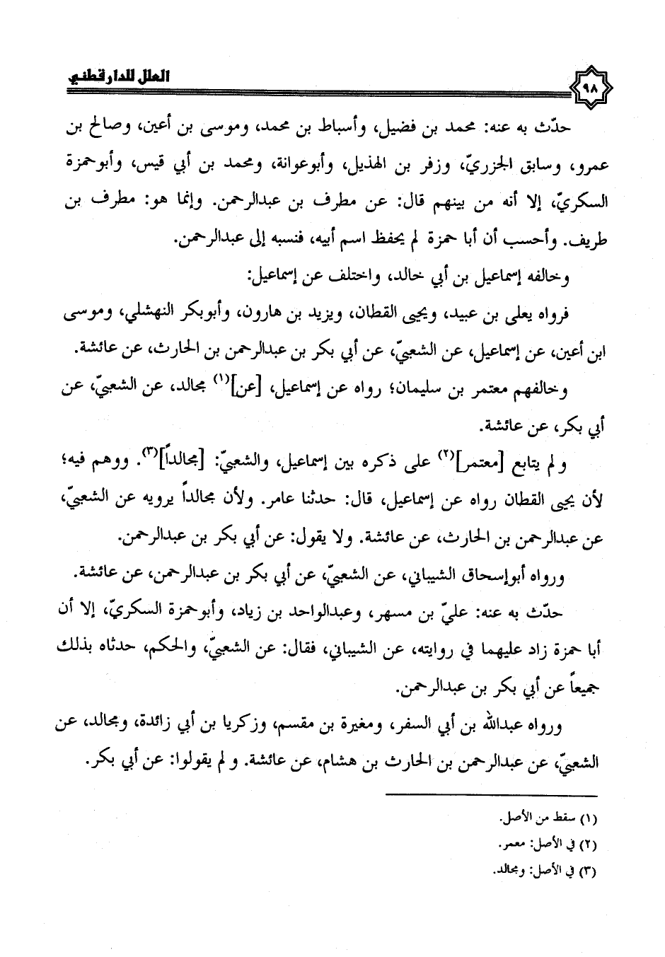 فرواه يعلى بن عبيد، ويحيى القطان، ويزيد بن هارون، وأبو بكر النهشلي، وموسى بْنُ أَعْيَنَ، عَنْ إِسْمَاعِيلَ، عَنِ الشَّعْبِيِّ، عَنْ أَبِي بَكْرِ بْنِ عَبْدِ الرَّحْمَنِ بْنِ الْحَارِثِ، عن عائشة وخالفهم معتمر بن سليمان، رواه عن إسماعيل، عن مجالد، عن الشعبي، عن أبي بكر، عن عائشة ولم يتابع معتمر على ذكره بين إسماعيل، والشعبي: مجالدا، ووهم فيه لأن يحيى القطان رواه عن إسماعيل، قال: حدثنا عامر، ولأن مجالدا يرويه عن الشعبي، عن عبد الرحمن بن الحارث، عن عائشة، ولا يقول: عن أبي بكر بن عبد الرحمن.