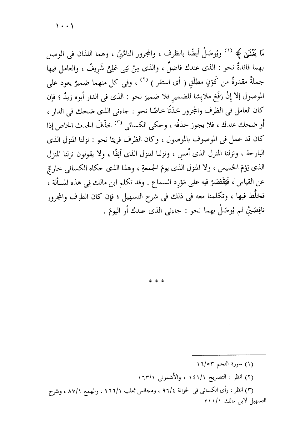 ما يغشى] ويوصل أيضًا بالظرف، والمجرور التأمين، وهما اللذان في الوصل بهما فائدة نحو: الذي عندك فاضل، والذي من بني علي شريف، والعامل فيها جملة مقدرة من كون مطلق (أي استقر)، وفي كل منهما ضمير يعود على الموصول إلا إن رفع ملابسًا للضمير فلا ضمير نحو: الذي في الدار أبوه زيد؛ فإن كان العامل في الظرف والمجرور حدثًا خاصًا نحو: جاءني الذي ضحك في الدار، أو ضحك عندك، فلا يجوز حذفه، وحكى الكسائي حذف الحدث الخاص إذا كان قد عمل في الموصوف بالموصول، وكان الظرف قريبًا نحو: نزلنا المنزل الذي البارحة، ونزلنا المنزل الذي أمس، ونزلنا المنزل الذي آنفًا، ولا يقولون نزلنا المنزل الذي يوم الخميس، ولا المنزل الذي يوم الجمعة، وهذا الذي حكاه الكسائي خارج عن القياس، فيقتصر فيه على مورد السماع. وقد تكلم ابن مالك في هذه المسألة، فخلط فيها، وتكلمنا معه في ذلك في شرح التسهيل، فإن كان الظرف والمجرور ناقصين لم يوصل بهما نحو: جاءني الذي عندك أو اليوم.