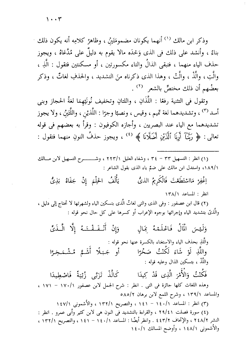 وتقول في التثنية رفعًا: اللذان، واللتان وتخفيف نونيهما لغة الحجاز وبني أسد، وتشديدهما لغة تميم، وقيس، ونصبًا وجرًا: اللذين، واللتين، ولا يجوز تشديدهما مع الياء عند البصريين، وأجازه الكوفيون: وقرأ به بعضهم في قوله تعالى: [ربنا أرنا الذين أضلانا]، ويجوز حذف النون منهما فتقول: