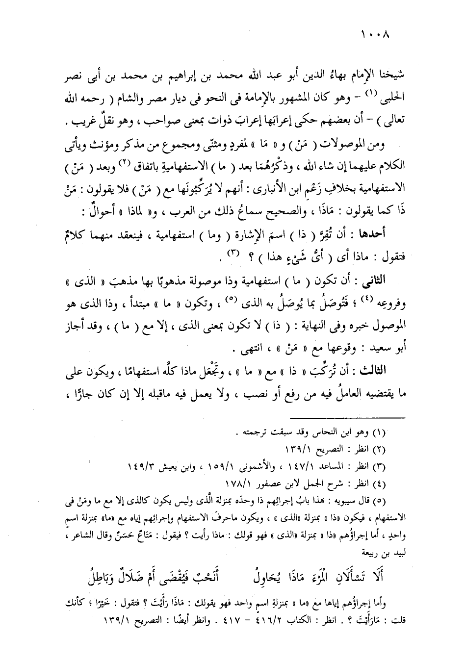 الثاني: أن تكون (ما) استفهامية وذا موصولة مذهوبًا بها مذهب «الذي» وفروعه؛ فتوصل بما يوصل به الذي، وتكون «ما» مبتدأ، وذا الذي هو الموصول خبره وفي النهاية: (ذا) لا تكون بمعنى الذي، إلا مع (ما)، وقد أجاز أبو سعيد: وقوعها مع «من»، انتهى.