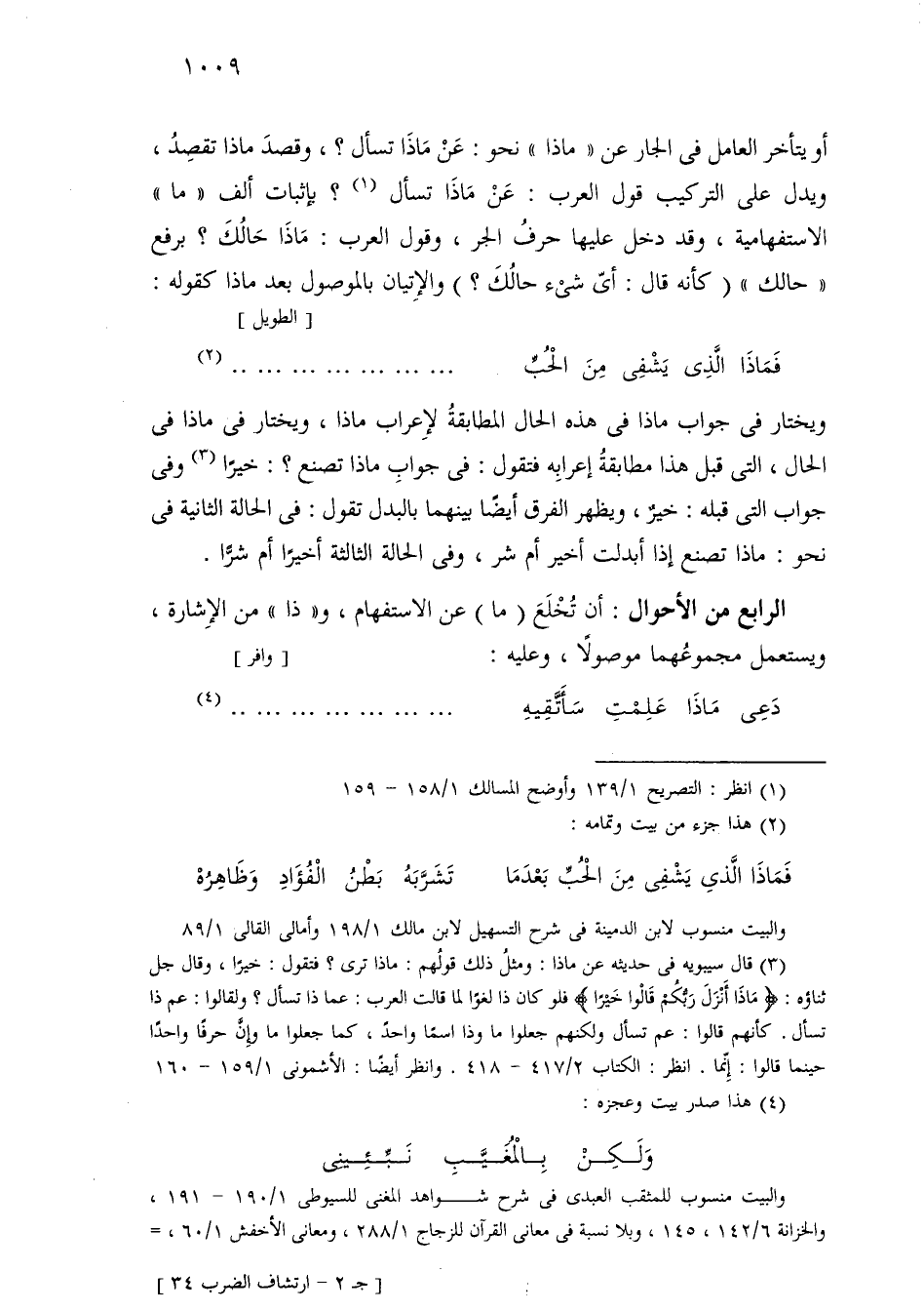 ويختار في جواب ماذا في هذه الحال المطابقة لإعراب ماذا، ويختار في ماذا في الحال، التي قبل هذا مطابقة إعرابه فتقول: في جواب ماذا تصنع؟: خيرًا وفي جواب التي قبله: خير، ويظهر الفرق أيضًا بينهما بالبدل تقول: في الحالة الثانية في نحو: ماذا تصنع إذا أبدلت أخير أم شر، وفي الحالة الثالثة أخيرًا أم شرًا.