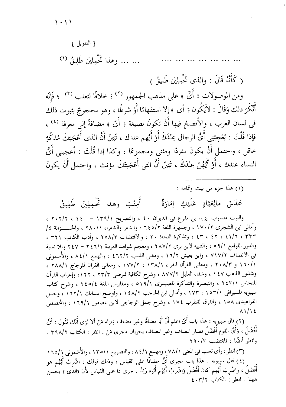 ومن الموصولات «أي» على مذهب الجمهور؛ خلافًا لثعلب؛ فإنه أنكر ذلك وقال: لا يكون «أي» إلا استفهامًا أو شرطًا، وهو محجوج بثبوت ذلك في لسان العرب، والأفصح فيها أن تكون بصيغة «أي» مضافة إلى معرفة، فإذا قلت: يعجبني أي الرجال عندك أو أيهم عندك، تبين أن الذي أعجبك مذكر عاقل، واحتمل أن يكون مفردًا ومثنى ومجموعًا، وكذا إذا قلت: أعجبني أي النساء عندك، أو أيهن عندك، تبين أن التي أعجبتك مؤنث، واحتمل أن يكون