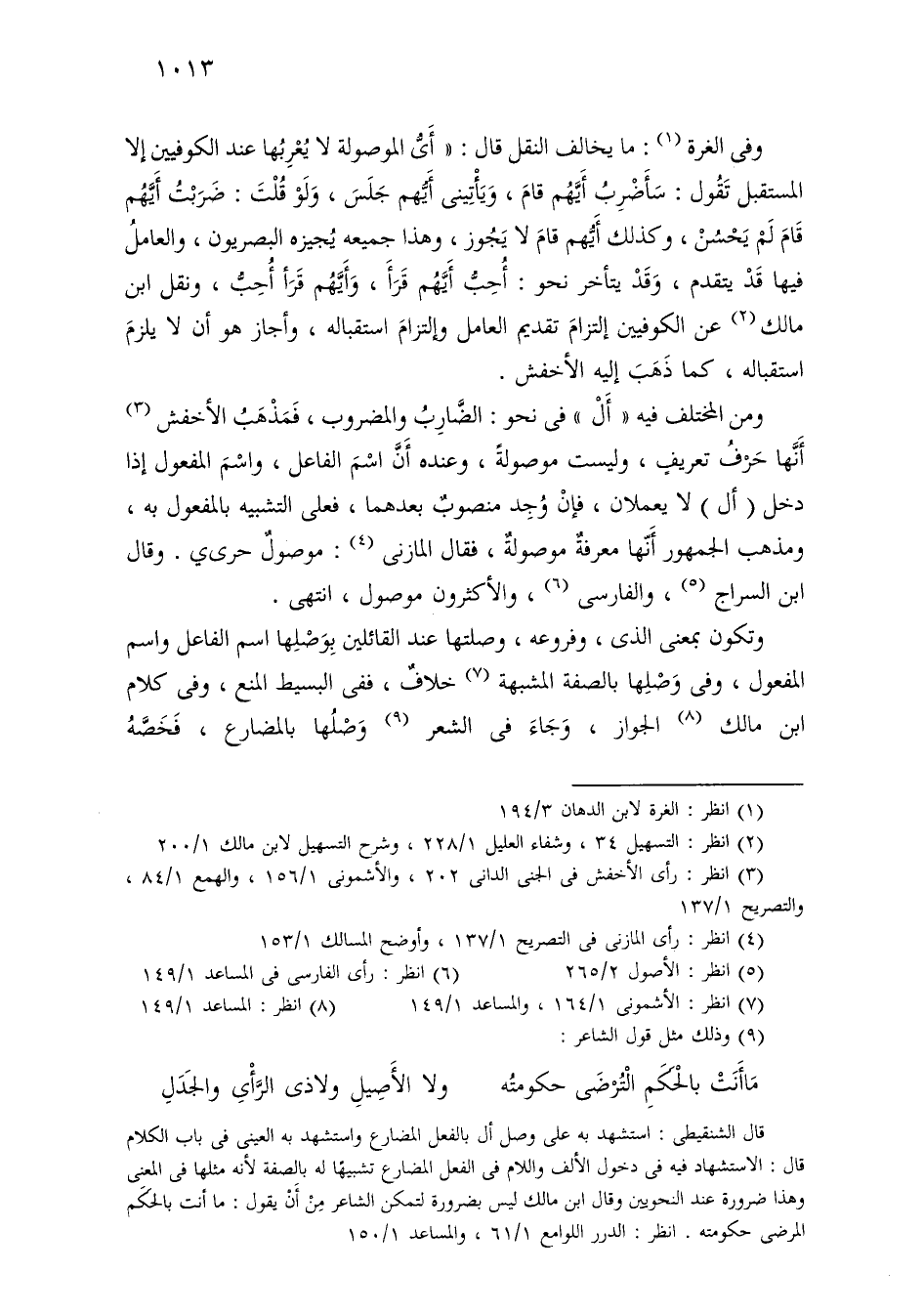 ومن المختلف فيه «أل» في نحو: الضارب والمضروب، فمذهب الأخفش أنها حرف تعريف، وليست موصولة، وعنده أن اسم الفاعل، واسم المفعول إذا دخل (أل) لا يعملان، فإن وجد منصوب بعدهما، فعلى التشبيه بالمفعول به، ومذهب الجمهور أنها معرفة موصولة، فقال المازني: موصول حرىي. وقال ابن السراج، والفارسي، والأكثرون موصول، انتهى.