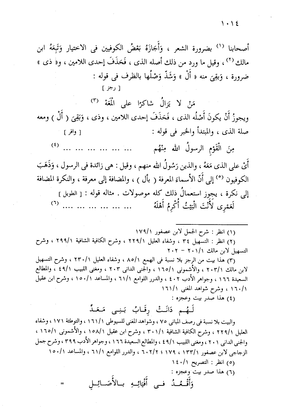 أصحابنا بضرورة الشعر، وأجازه بعض الكوفيين في الاختيار وتبعه ابن مالك، وقيل ما ورد من ذلك أصله الذي، فحذف إحدى اللامين، و «ذي» ضرورة، وبقى منه «أل» وشذ وصلها بالظرف في قوله: