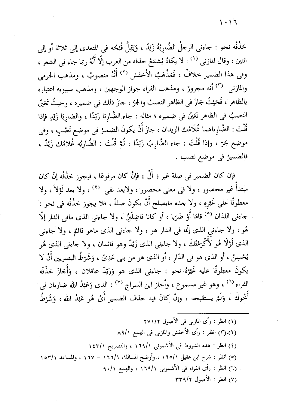 حذفه نحو: جاءني الرجل الضاربه زيد، ويقل قبحه في المتعدي إلى ثلاثة أو إلى اثنين، وقال المازني: لا يكاد يسمع حذفه من العرب إلا أنه ربما جاء في الشعر، وفي هذا الضمير خلاف، فمذهب الأخفش أنه منصوب، ومذهب الجرمي والمازني أنه مجرور، ومذهب الفراء جواز الوجهين، ومذهب سيبويه اعتباره بالظاهر، فحيث جاز في الظاهر النصب والجر، جاز ذلك في ضميره، وحيث تعين النصب في الظاهر تعين في ضميره؛ مثاله: جاء الضاربا زيدًا، والضاربا زيد فإذا قلت: الضاربهما غلامك الزيدان، جاز أن يكون الضمير في موضع نصب، وفي موضع جر، وإذا قلت: جاء الضارب زيدًا، ثم قلت: الضاربه غلامك زيد، فالضمير في موضع نصب.