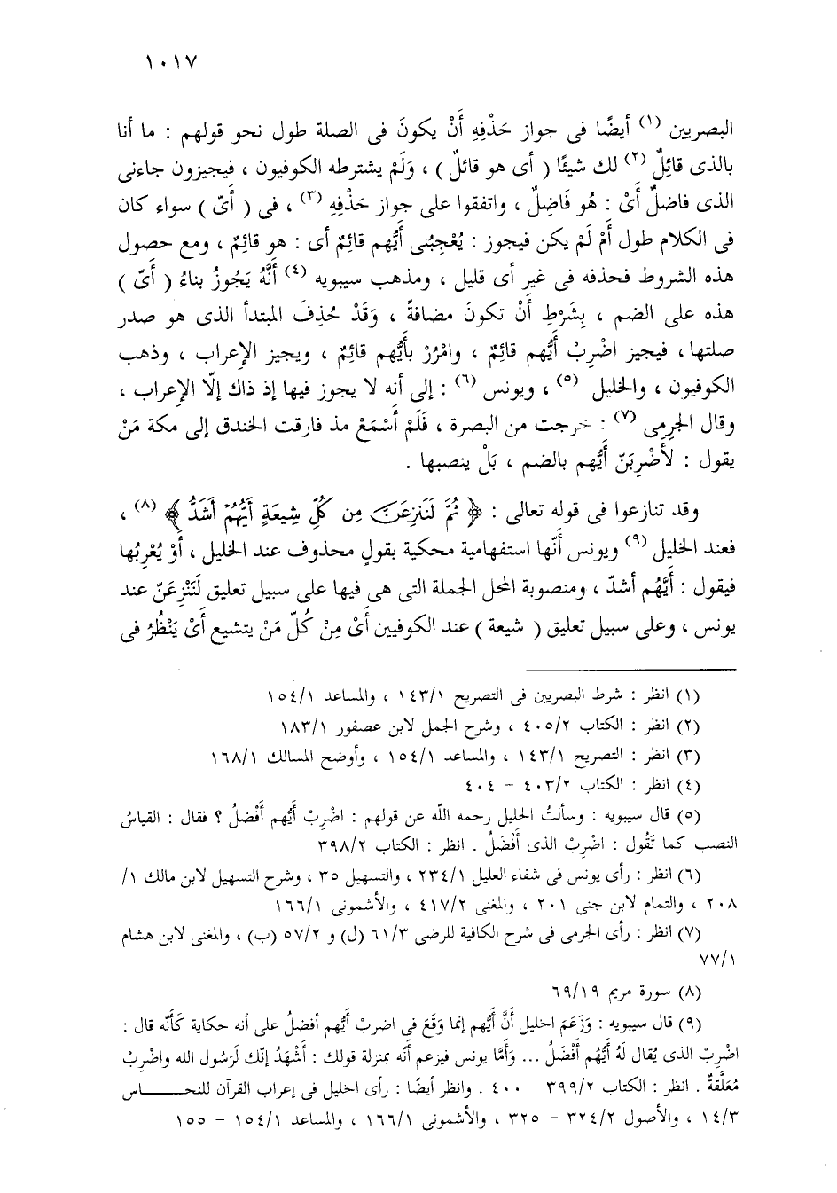 البصريين أيضًا في جواز حذفه أن يكون في الصلة طول نحو قولهم: ما أنا بالذي قائل لك شيئًا (أي هو قائل)، ولم يشترطه الكوفيون، فيجيزون جاءني الذي فاضل أي: هو فاضل، واتفقوا على جواز حذفه، في (أي) سواء كان في الكلام طول أم لم يكن فيجوز: يعجبني أيهم قائم أي: هو قائم، ومع حصول هذه الشروط فحذفه في غير أي قليل، ومذهب سيبويه أنه يجوز بناء (أي) هذه على الضم، بشرط أن تكون مضافة، وقد حذف المبتدأ الذي هو صدر صلتها، فيجيز اضرب أيهم قائم، وامرر بأيهم قائم، ويجيز الإعراب، وذهب الكوفيون، والخليل، ويونس: إلى أنه لا يجوز فيها إذ ذاك إلا الإعراب، وقال الجرمي: خرجت من البصرة، فلم أسمع مذ فارقت الخندق إلى مكة من يقول: لأضربن أيهم بالضم، بل ينصبها.