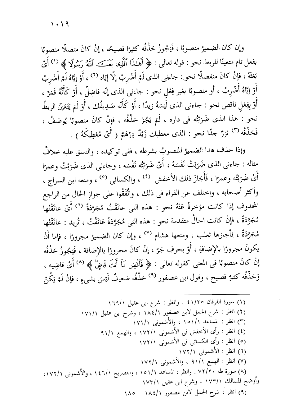 وإن كان الضمير منصوبًا، فيجوز حذفه كثيرًا فصيحًا، إن كان متصلاً منصوبًا بفعل تام متعينًا للربط نحو: قوله تعالى: [أهذا الذي بعث الله رسولاً] أي بعثه، فإن كان منفصلاً نحو: جاءني الذي لم أضرب إلا إياه، أو إياه لم أضرب أو إياه أضرب، أو منصوبًا بغير فعل نحو: جاءني الذي إنه فاضل، أو كأنه قمر، أو بفعل ناقص نحو: جاءني الذي ليسه زيدًا، أوكأنه صديقك، أو لم يتعين الربط نحو: هذا الذي ضربته في داره، لم يجز حذفه، فإن كان منصوبًا يوصف، فحذفه نزر جدًا نحو: الذي معطيك زيد درهم (أي معطيكه).
