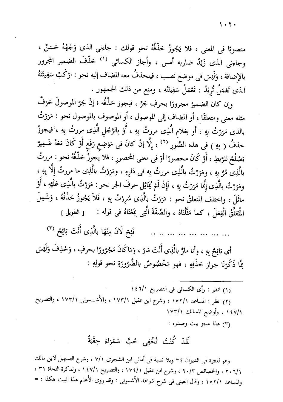 منصوبًا في المعنى، فلا يجوز حذفه نحو قولك: جاءني الذي وجهه حسن، وجاءني الذي زيد ضاربه أمس، وأجاز الكسائي حذف الضمير المجرور بالإضافة، وليس في موضع نصب، فينحذف معه المضاف إليه نحو: اركب سفينته الذي تعمل تريد: تعمل سفينته، ومنع من ذلك الجمهور.